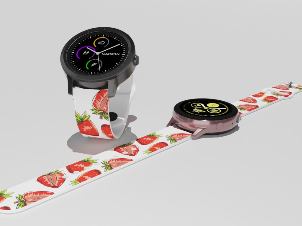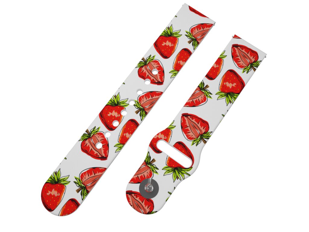 Bílý náhradní řemínek pro chytré hodinky s potiskem červených jahod. Sesbírali jsme pro vás ty nejšťavnatější kousky a otiskli je na pásek k vašim hodinkám.