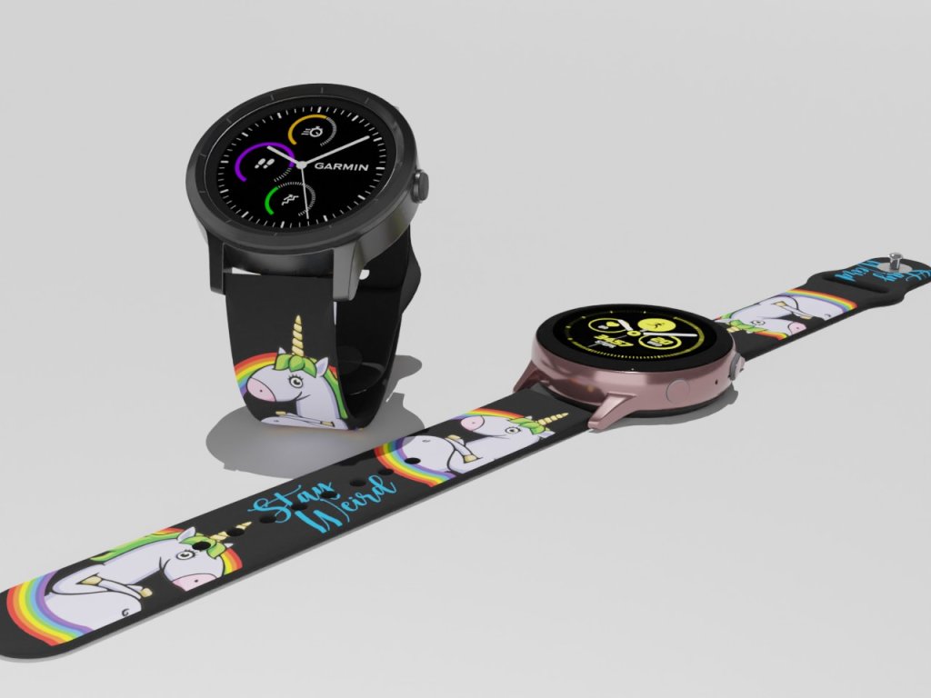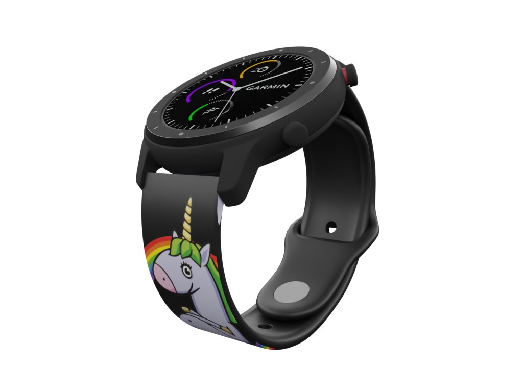 Černý náhradní řemínek pro chytré hodinky s potiskem "roztomilých" jednorožců s duhou