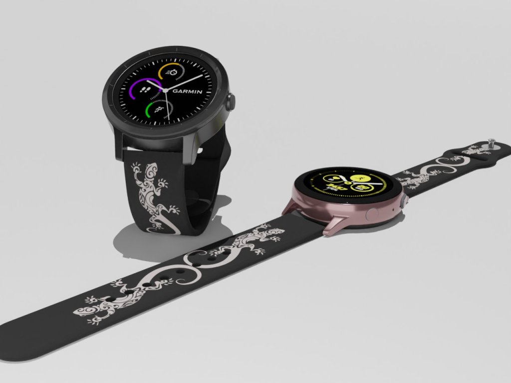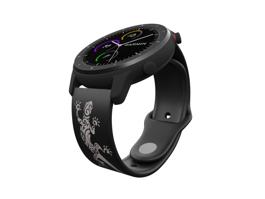 Černý náhradní řemínek pro chytré hodinky s bílým potiskem tribalových ještěrek.