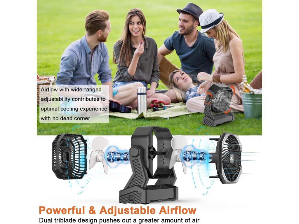 Ventilátor nabízí nastavitelnou výšku i sklon, takže si můžeš proudění vzduchu přizpůsobit přesně podle potřeby. Díky možnosti uchycení pomocí klipsu nebo postavení na stůl je jeho použití velmi flexibilní. Nechybí ani funkce osvětlení, která se hodí při kempování nebo večerním použití.