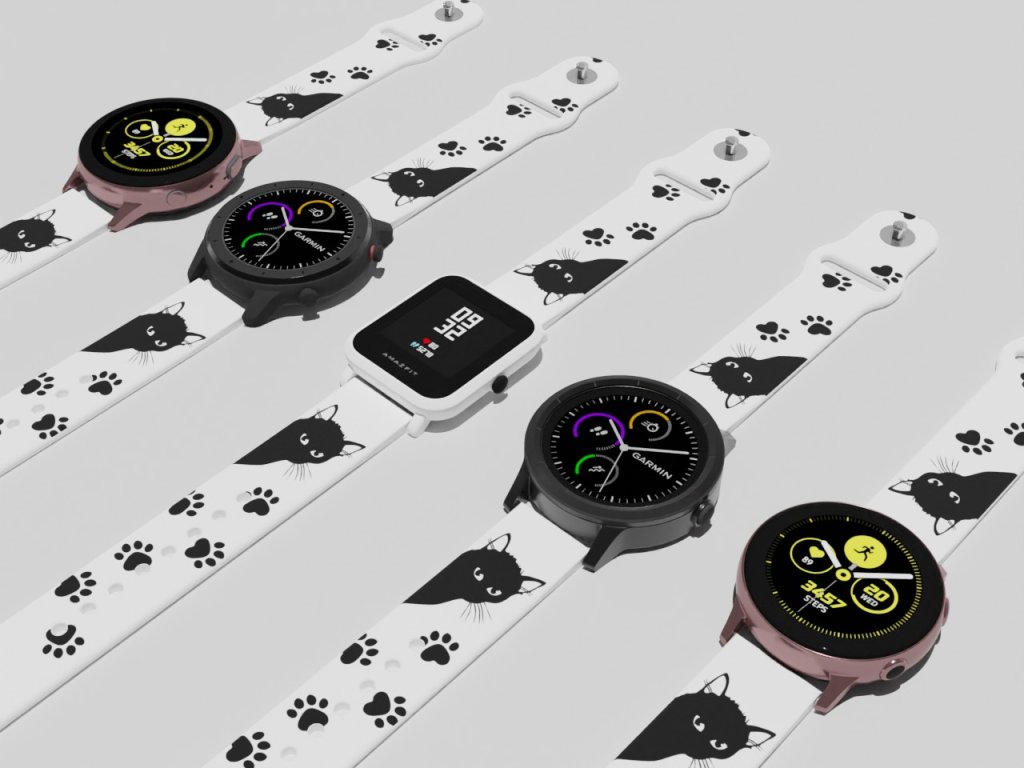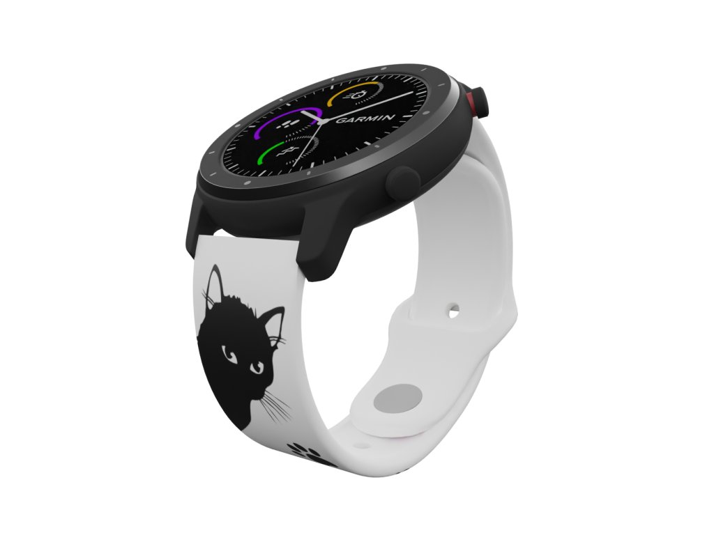 Bílý náhradní řemínek pro chytré hodinky s potiskem černé kočičky a tlapek.