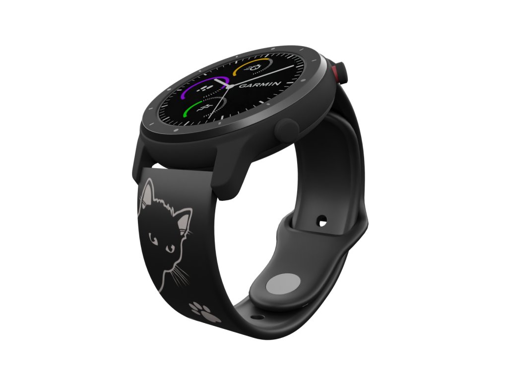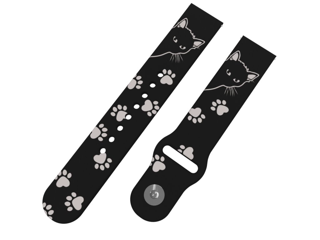 Černý náhradní řemínek pro chytré hodinky s bílým potiskem kočičky a tlapek. Pro kočičí milovníky, ať už doma máte jednu, dvě a nebo žádnou.