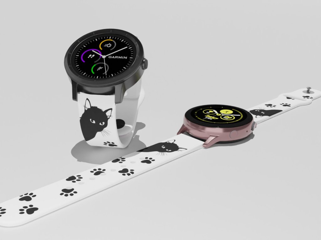Bílý náhradní řemínek pro chytré hodinky s potiskem černé kočičky a tlapek. Pro kočičí milovníky, ať už doma máte jednu, dvě a nebo žádnou.
