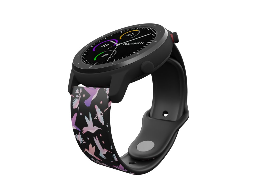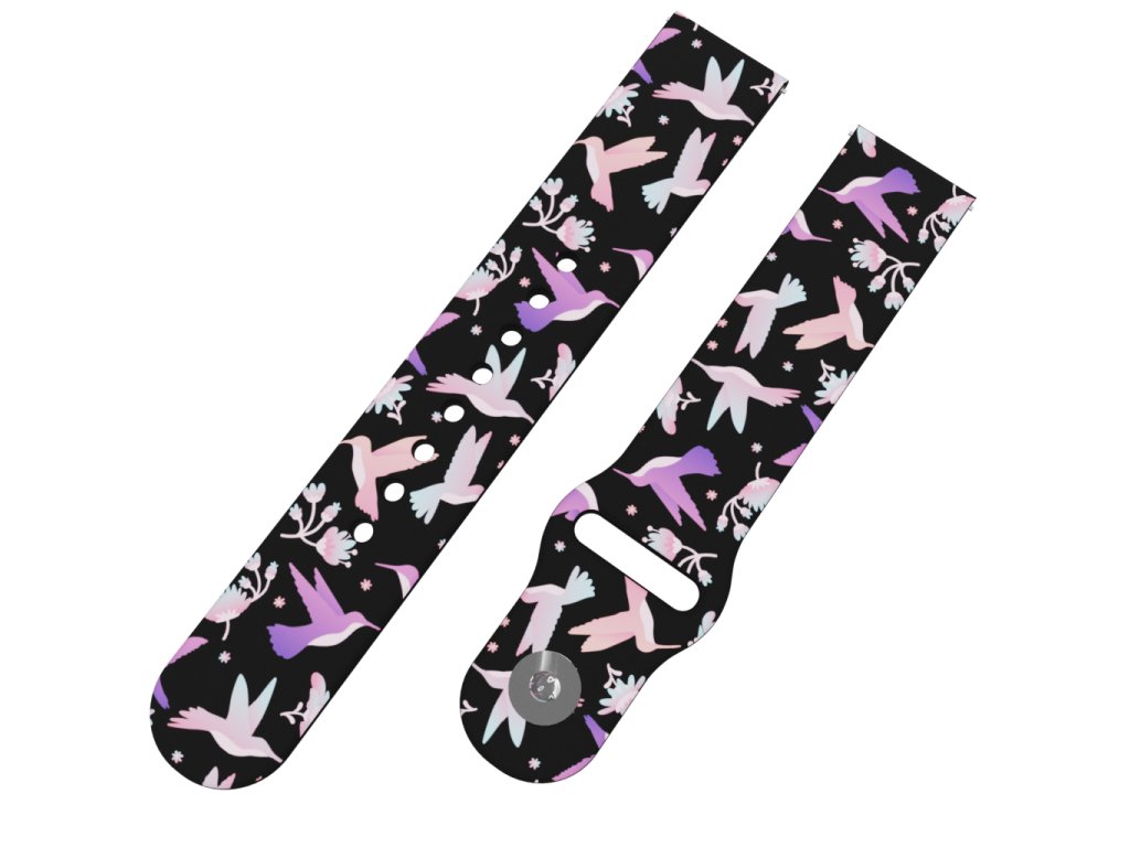 Černý náhradní řemínek pro chytré hodinky s barevným potiskem kolibříků