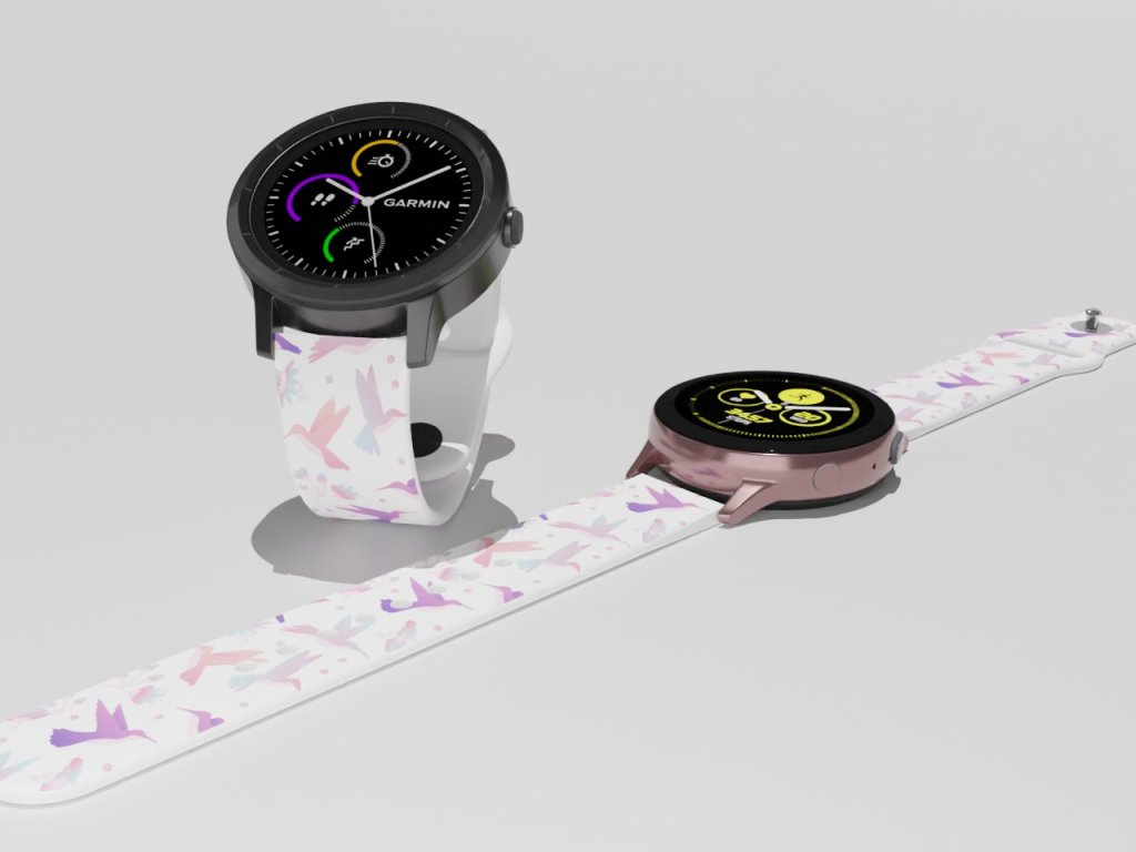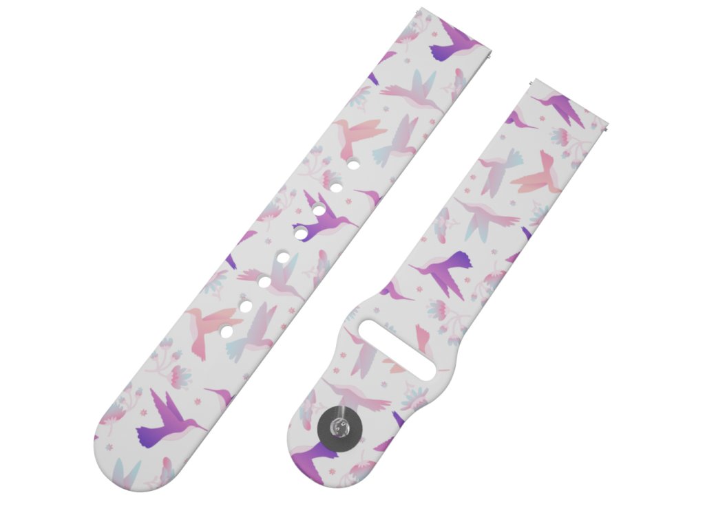 Bílý náhradní řemínek pro chytré hodinky s potiskem kolibříků. Kolibříci jsou charakterističtí svou malou velikostí, rychlými křídly a barevným peřím. Mějte své vlastní.