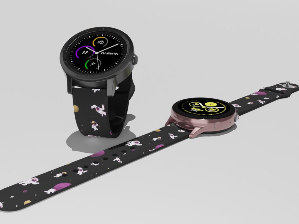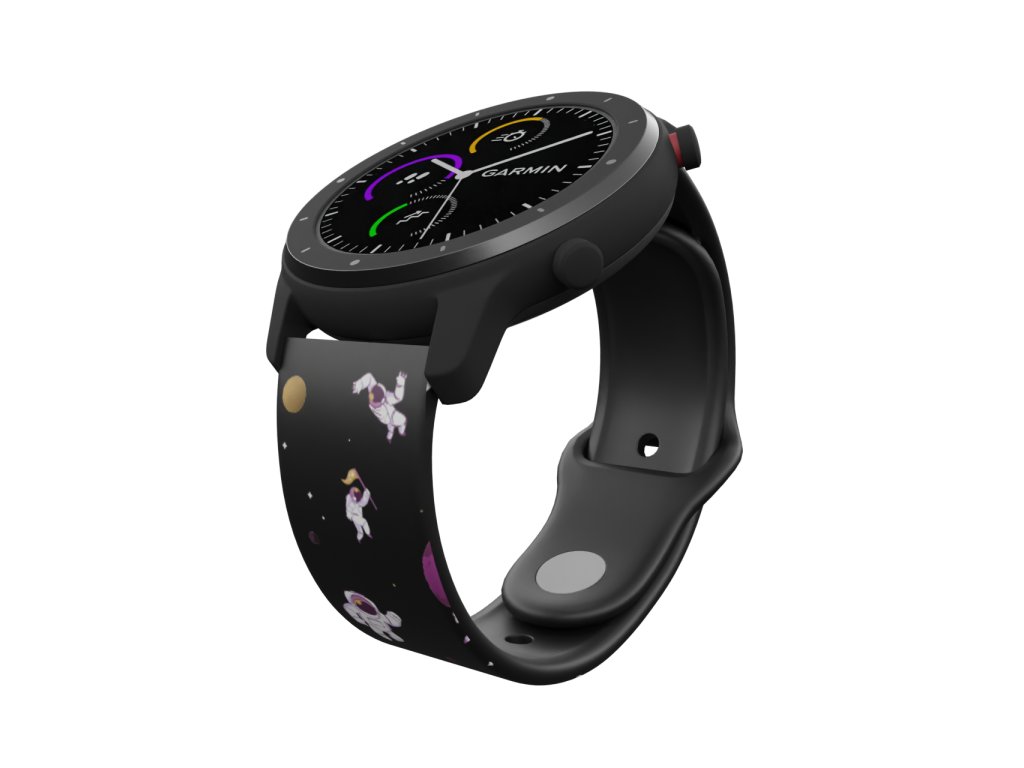 Černý náhradní řemínek pro chytré hodinky s potiskem kosmonautů ve vesmíru.