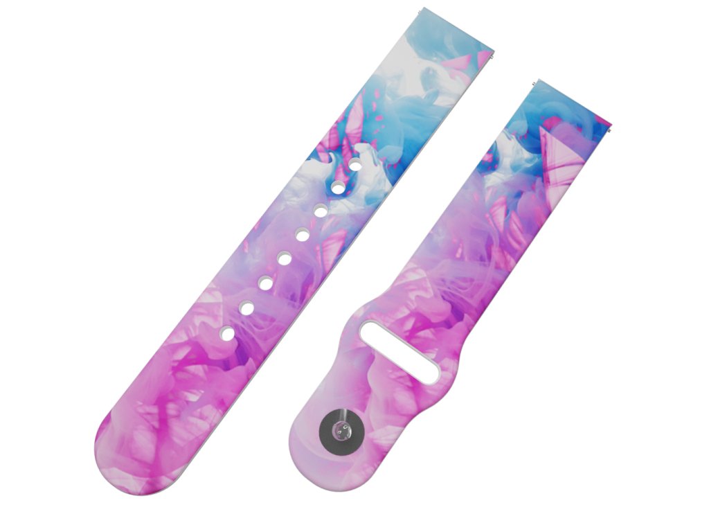 Bílý náhradní řemínek pro chytré hodinky s potiskem kouřovým potiskem v růžové a modré.