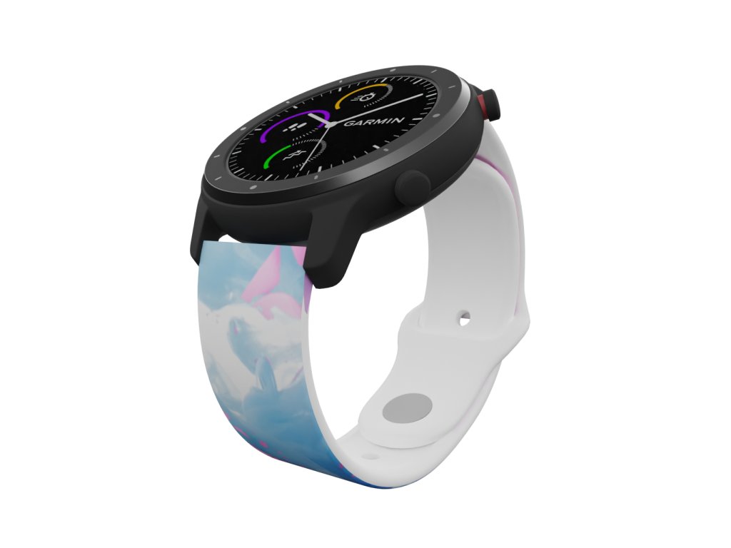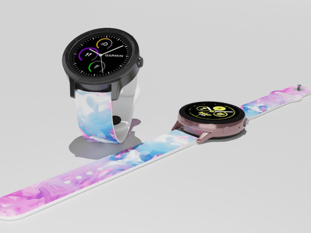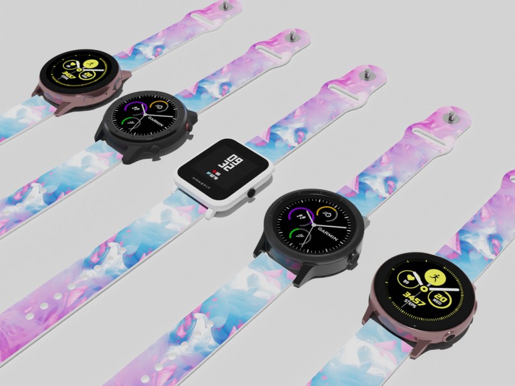 Bílý náhradní řemínek pro chytré hodinky s potiskem kouřovým potiskem v růžové a modré.