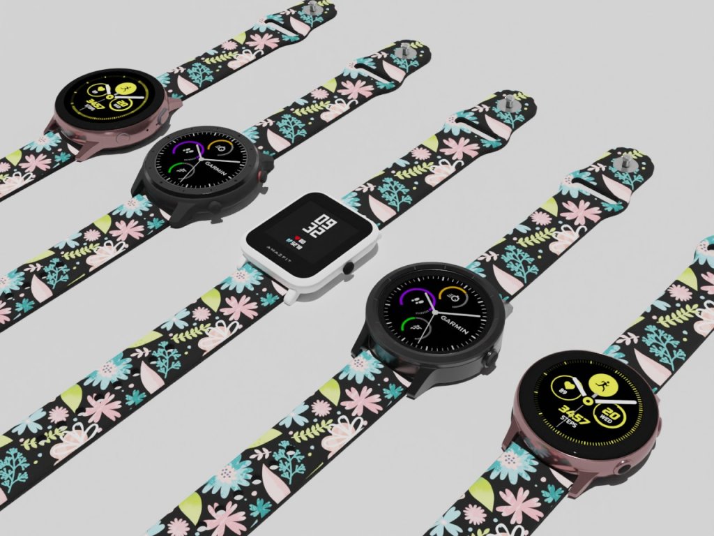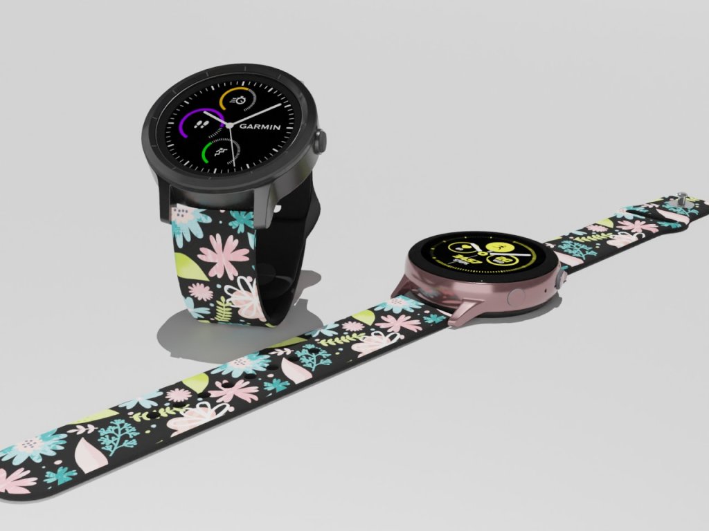 Černý náhradní řemínek pro chytré hodinky s potiskem květů a větviček. Hra barev na větvičkách a kytičkách láká snít o rozkvetlé louce uprostřed začarovaného lesa.