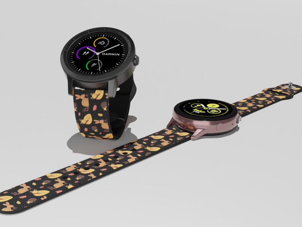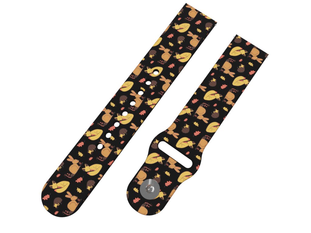 Černý náhradní řemínek pro chytré hodinky s potiskem bílých lesních zvířátek.