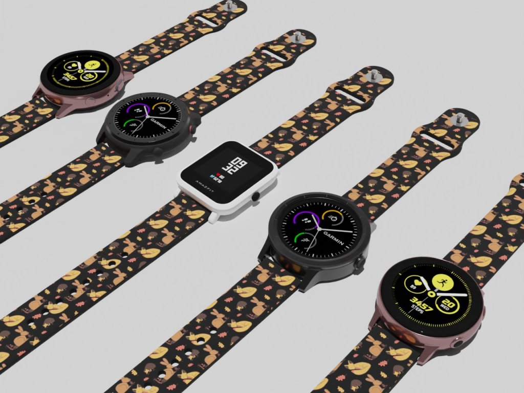 Černý náhradní řemínek pro chytré hodinky s potiskem bílých lesních zvířátek. Pozvěte si domů lišku, zajíčka nebo ježka i s podzimním listím.