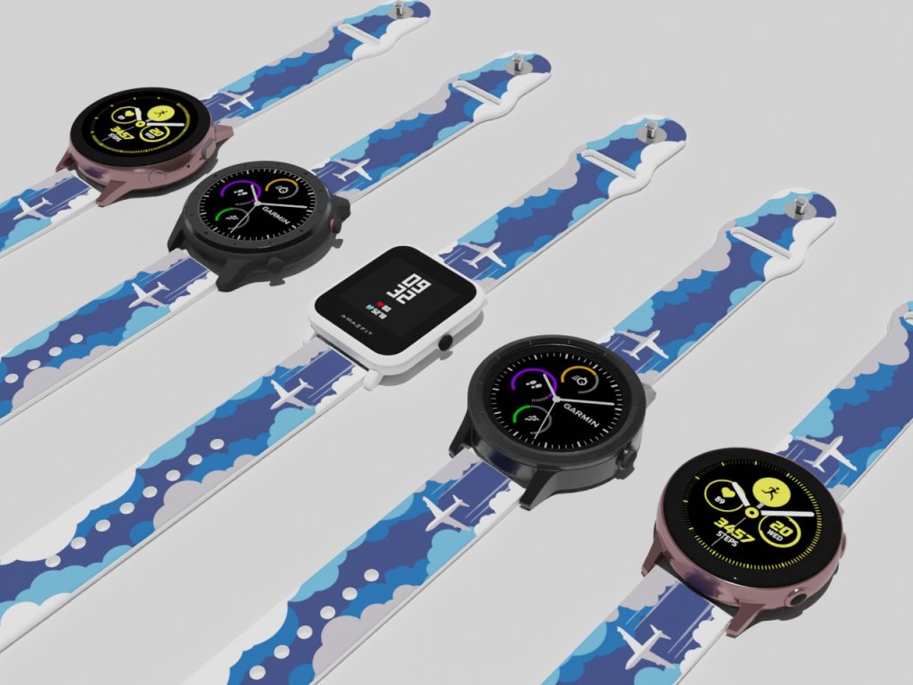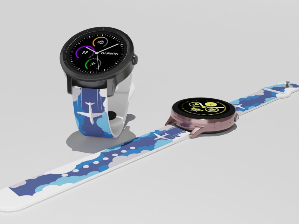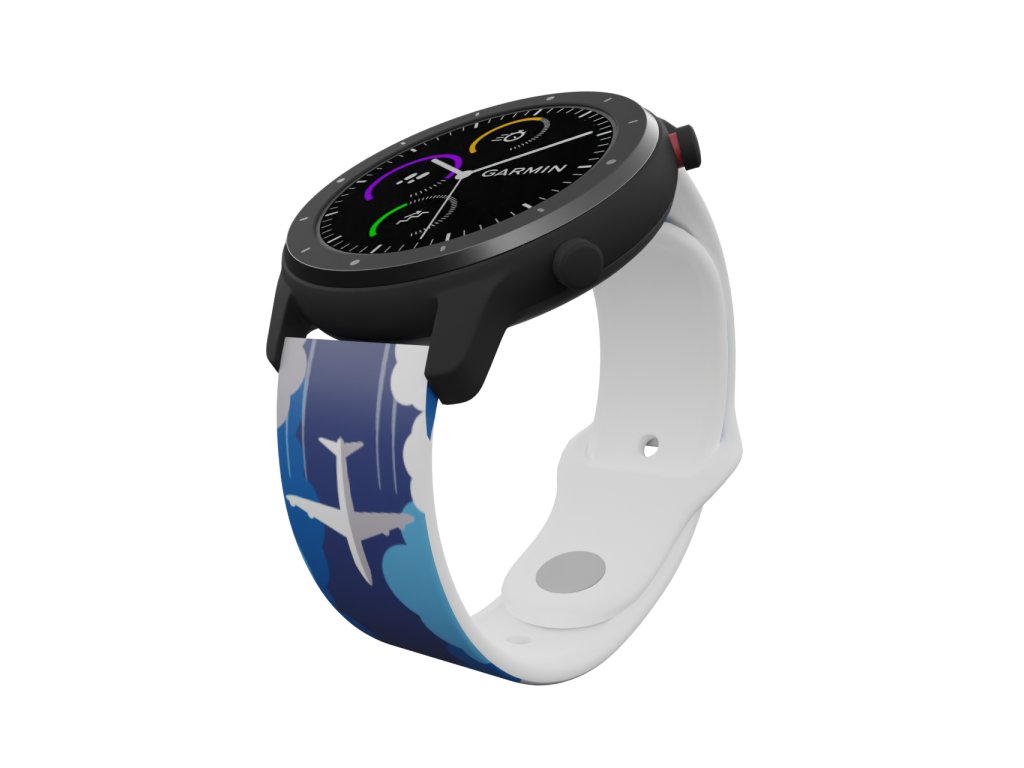 Bílý náhradní řemínek pro chytré hodinky s potiskem letadla v oblacích.