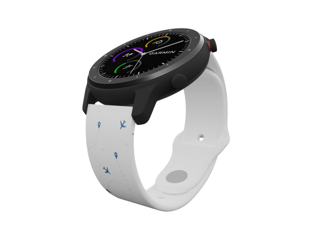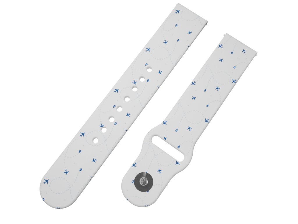 Bílý náhradní řemínek pro chytré hodinky s potiskem modrých letadel. Pro zaryté cestovatele s motivem letů letadel a jejich cílové destinace. Kam se vydáte příště?