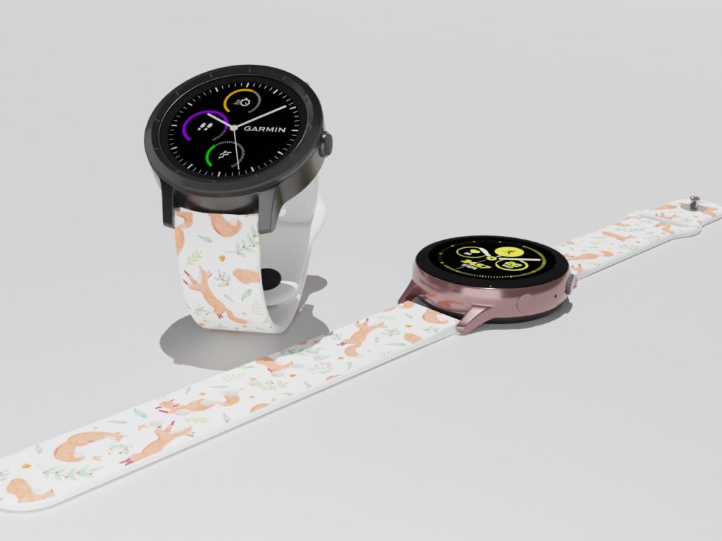Bílý náhradní řemínek pro chytré hodinky s barevným potiskem lištiček.