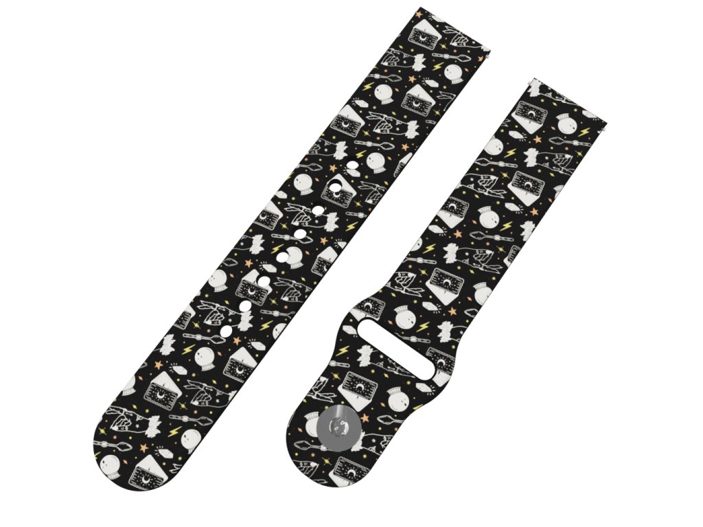 Černý náhradní řemínek pro chytré hodinky s potiskem magických prvků. Věštecká koule, kouzelníkova ruka i kniha.