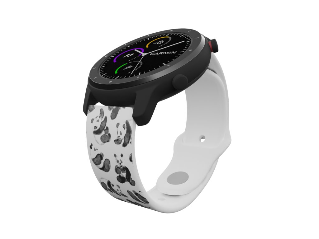 Bílý náhradní řemínek pro chytré hodinky s potiskem roztomilých malovaných pand. Pro všechny pandy, pandičky i panďáčata.