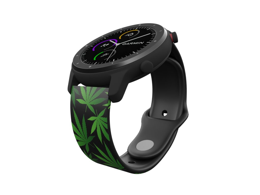Bílý náhradní řemínek pro chytré hodinky se zeleným potiskem listů marihuany. Uvolněná atmosféra, bez starostí a s úsměvem na rtech s touto bylinkou.