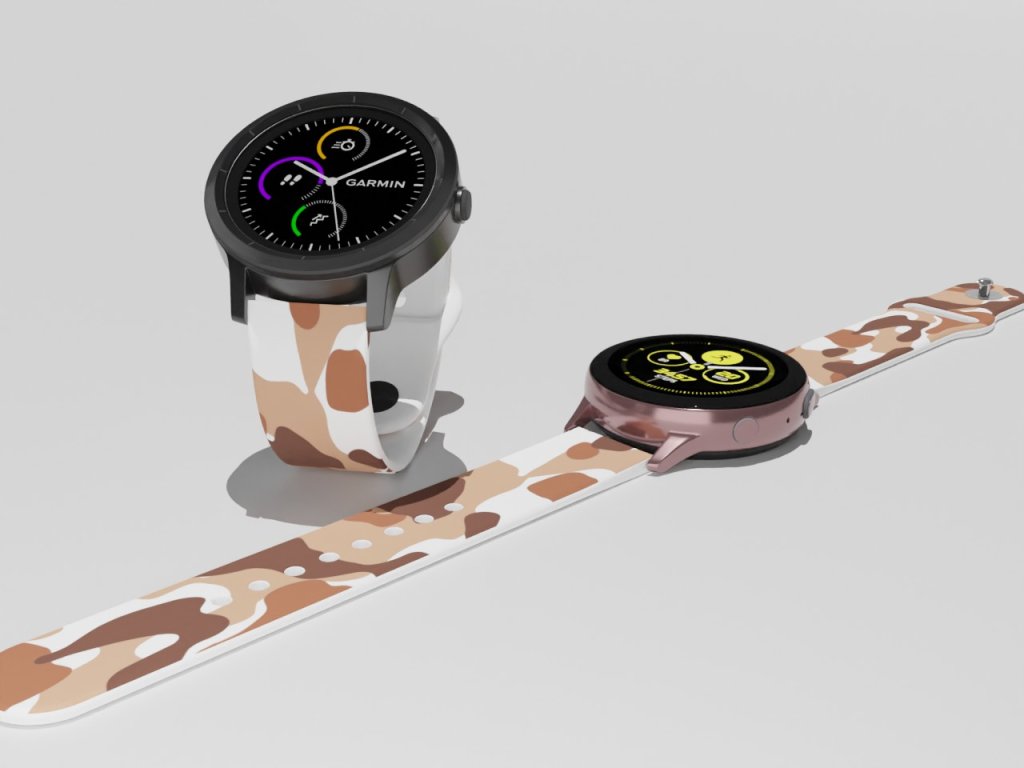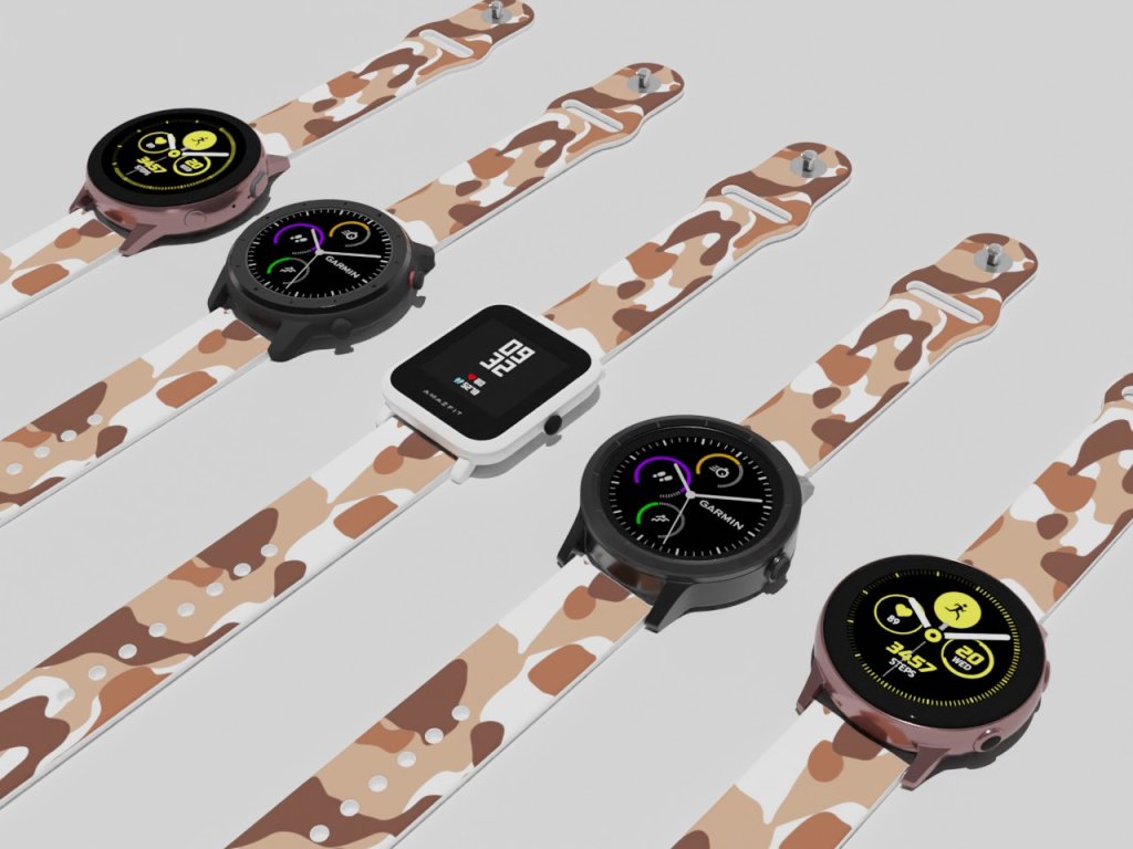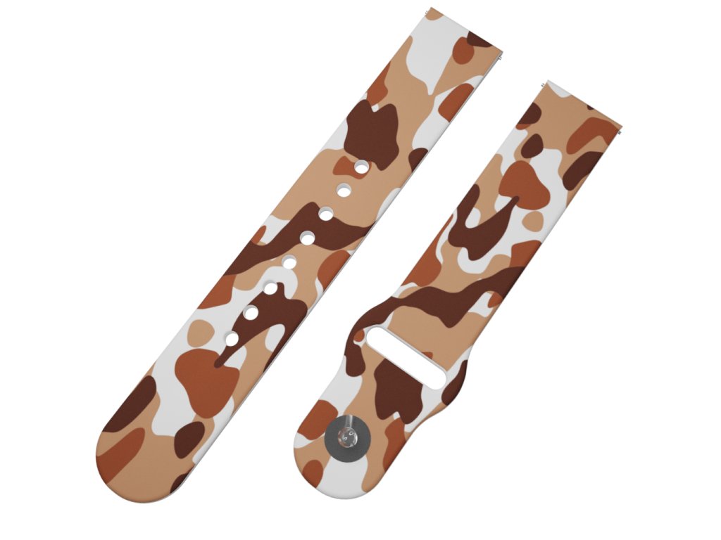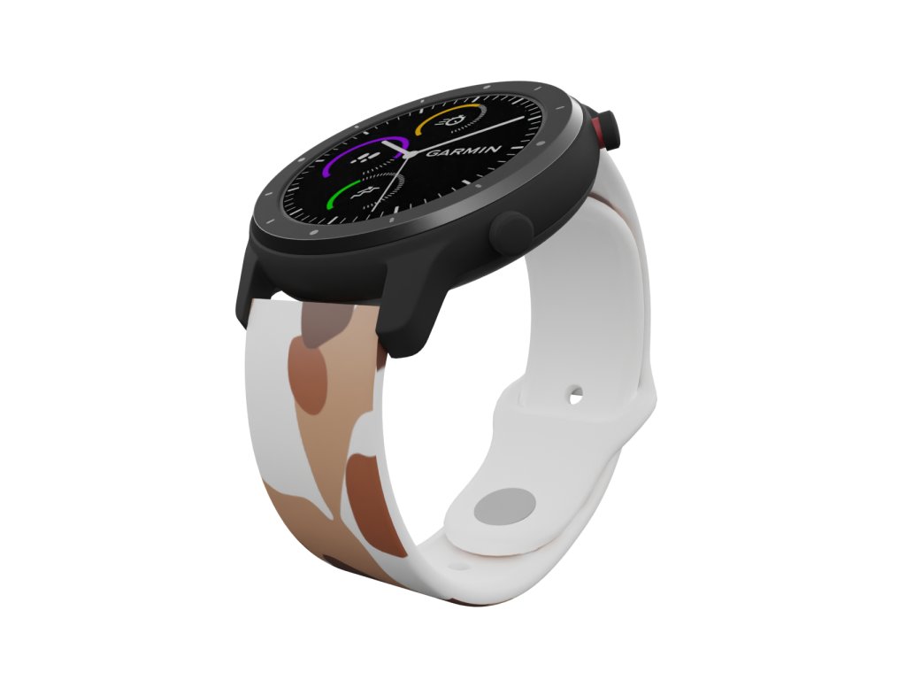 Bílý náhradní řemínek pro chytré hodinky s potiskem hnědého maskáče.
