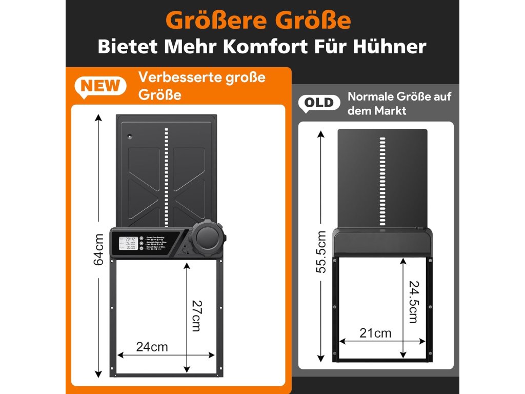 - Větší velikost pro snadný přístup: Naše automatická klapka na slepice má větší rám (27 cm x 24 cm) ve srovnání se standardními modely (24 cm x 21 cm), takže vaše kuřata, kachny a husy mohou bez problémů procházet. Rozlučte se s přeplněním a sledujte, jak se vaše stádo daří neomezenou svobodu!