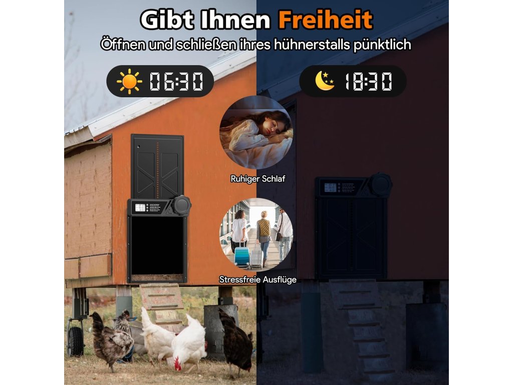 - Svoboda s funkcí časovače: Proměňte svou každodenní rutinu s naší nekomplikovanou funkcí časovače. Nastavte časovač dveří tak, aby se v požadovaných časech otevíral a zavíral. Vyspněte se, vydejte se na spontánní výlet nebo se uvolněte bez obav o manuální otevírání nebo zavírání dveří. Odpočívejte, zatímco vaše drůbež bude v bezpečí.