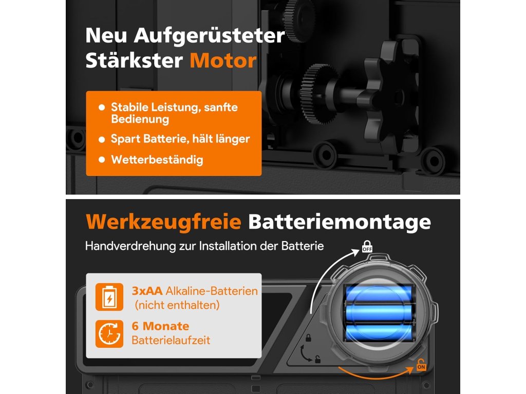 - Vybavený motor a provoz na baterie: Vylepšený motor zajišťuje větší trvanlivost a energetickou účinnost. Provoz na 3 AA baterie (nejsou součástí dodávky), vydrží až 6 měsíců, aniž by byl závislý na náladovém počasí. Přihrádka na baterie bez nářadí umožňuje rychlou a snadnou výměnu baterie.