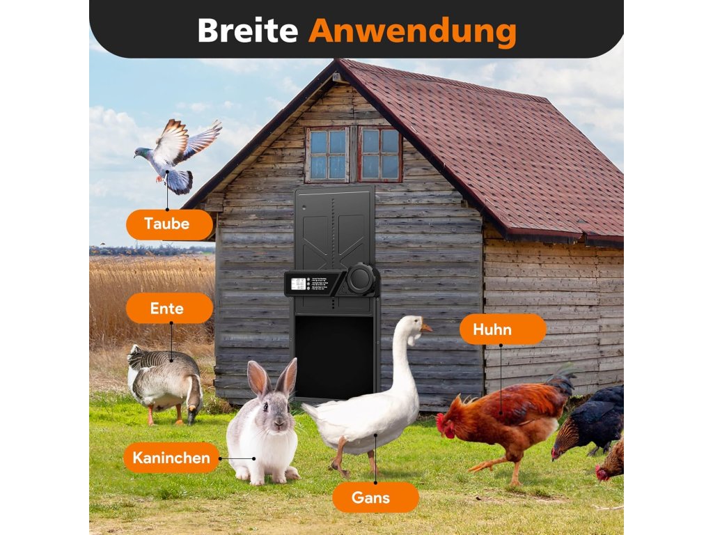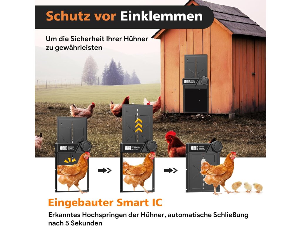 - Ochrana proti mačkání na ochranu kuřat: Bezpečnost je na prvním místě. Naše automatické dveře do kurníku jsou vybaveny moderní ochrannou technikou proti slepení Pokud je během zavírání zjištěno kuře nebo jiná překážka, zastaví se dveře po dobu 13 sekund. Pokud překážka přetrvává, vrátí se dveře, čeká 10 sekund a pokusí se znovu zavřít. takže vaši opeření přátelé mohou bezpečně projít, aniž by se zranili nebo zmáčkli.