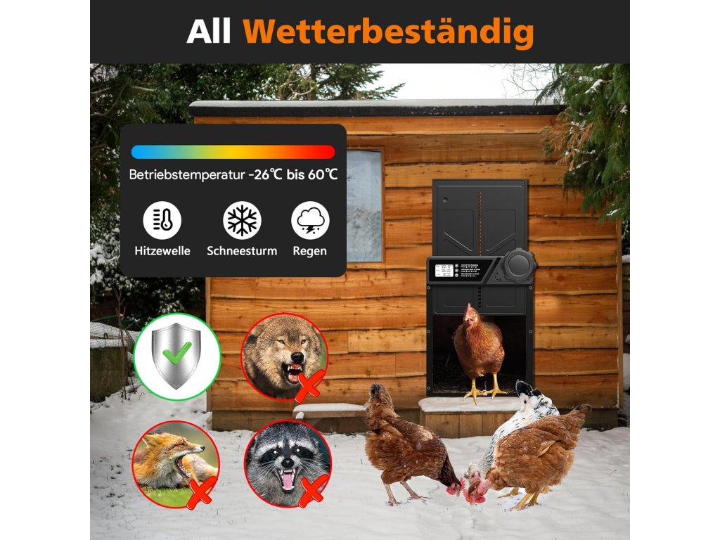- Odolná proti povětrnostním vlivům a robustní konstrukce: Vyrobeno z kvalitní hliníkové slitiny, tato elektrická klapka na slepice odolává extrémním povětrnostním podmínkám od -26 °C do 60 °C. Je odolná proti povětrnostním vlivům, vodotěsná a odolná proti útokům predátorů, což zaručuje dlouhodobou spolehlivost.