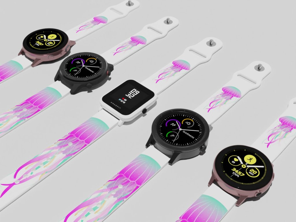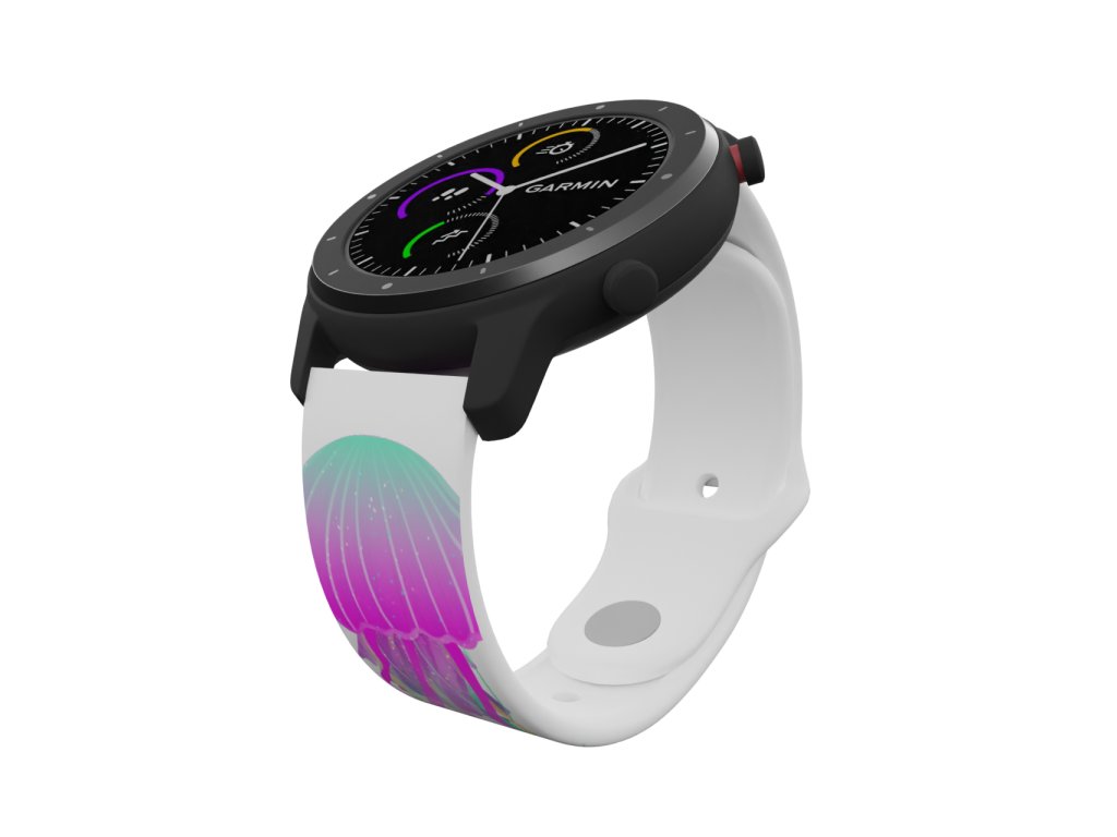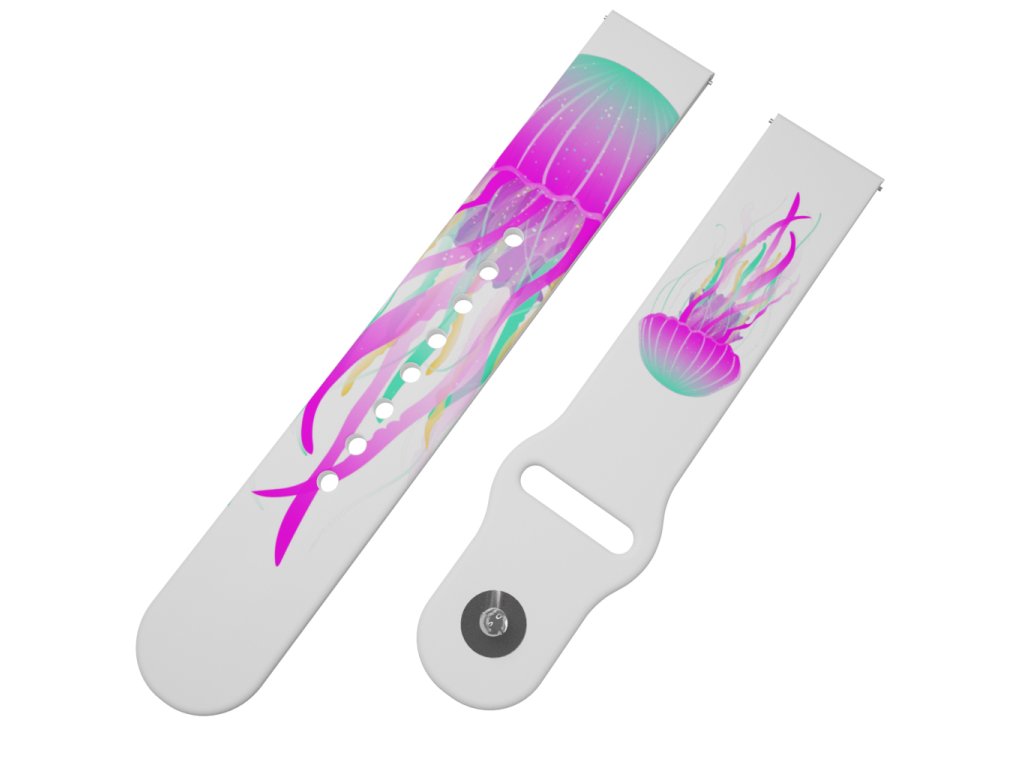Bílý náhradní řemínek s fialovo-tyrkysovou medúzou. Fascinující svět medúz přímo na vašem zápěstí jako ozdoba vašich chytrých hodinek.
