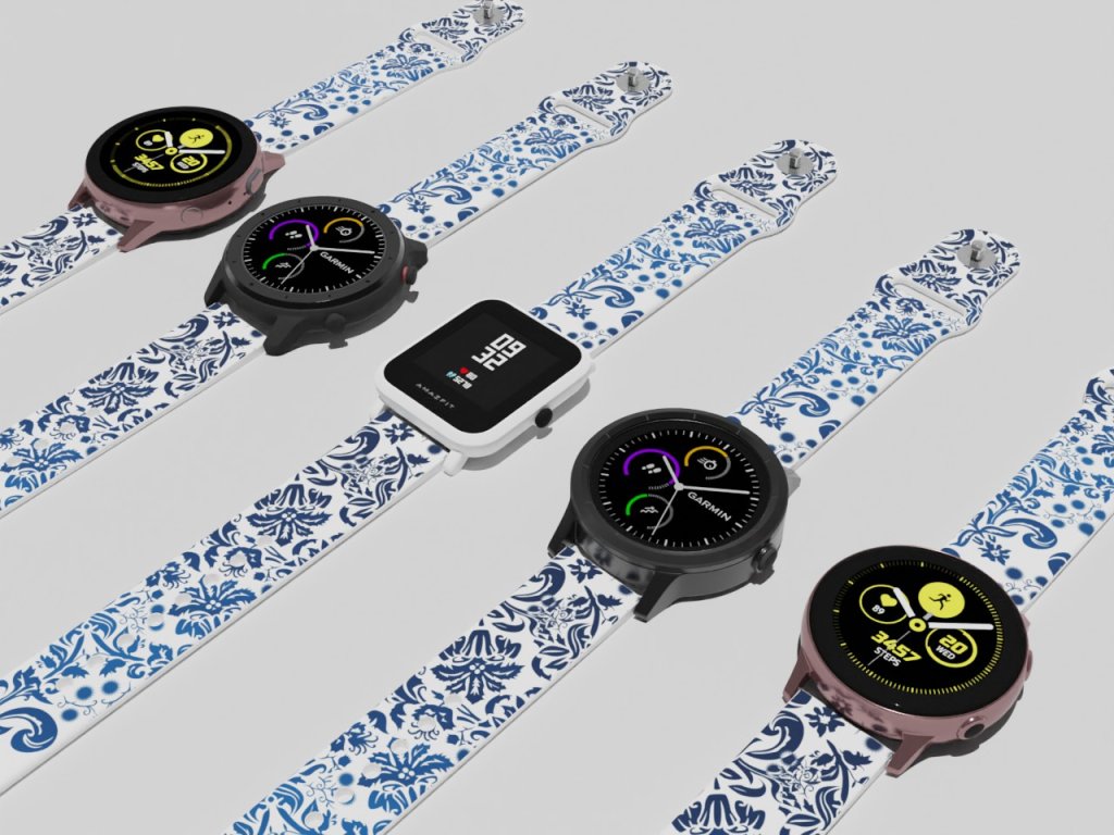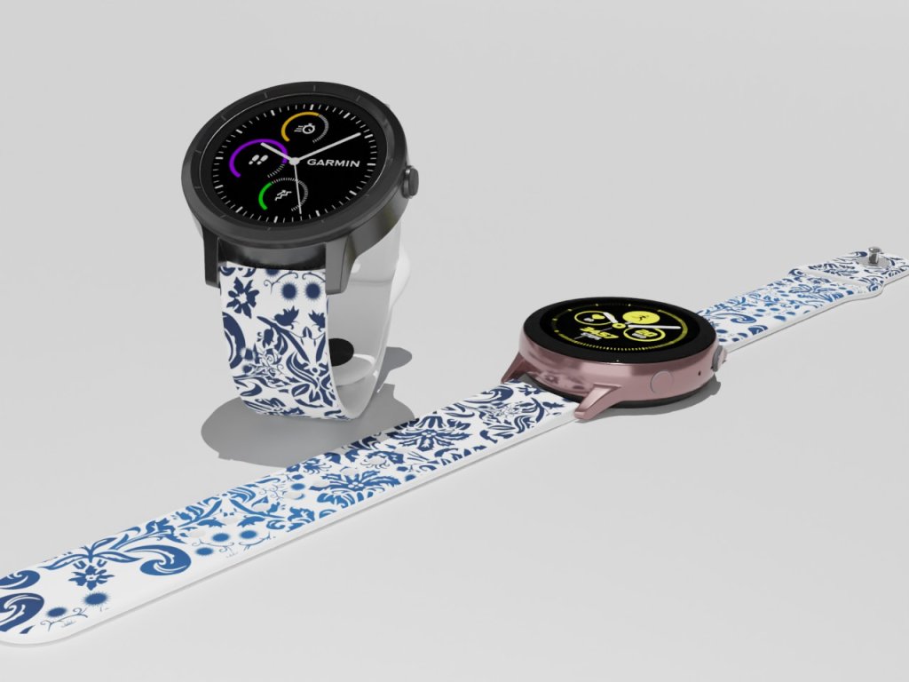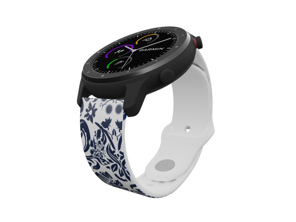 Bílý náhradní řemínek pro chytré hodinky s potiskem modrých květin. Dokonale ladící kombinace modré a bílé s jemným dotekem voňavých květin.