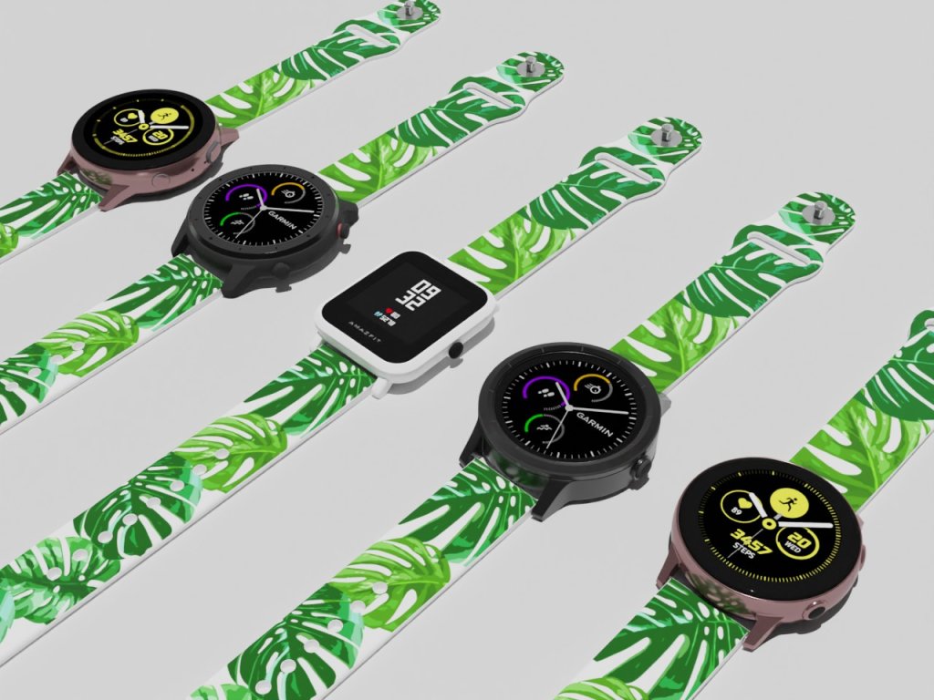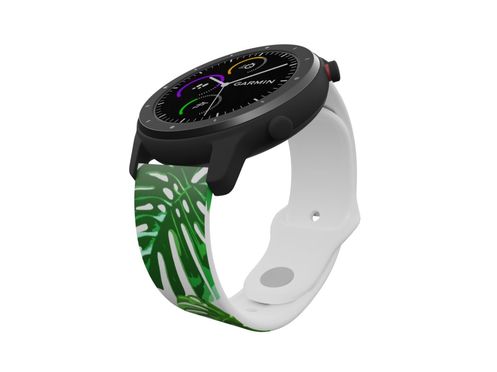 Bílý náhradní řemínek pro chytré hodinky s potiskem listů monstery. Dominantní tropická rostlina, která se těší oblibě snad v každé domácnosti.