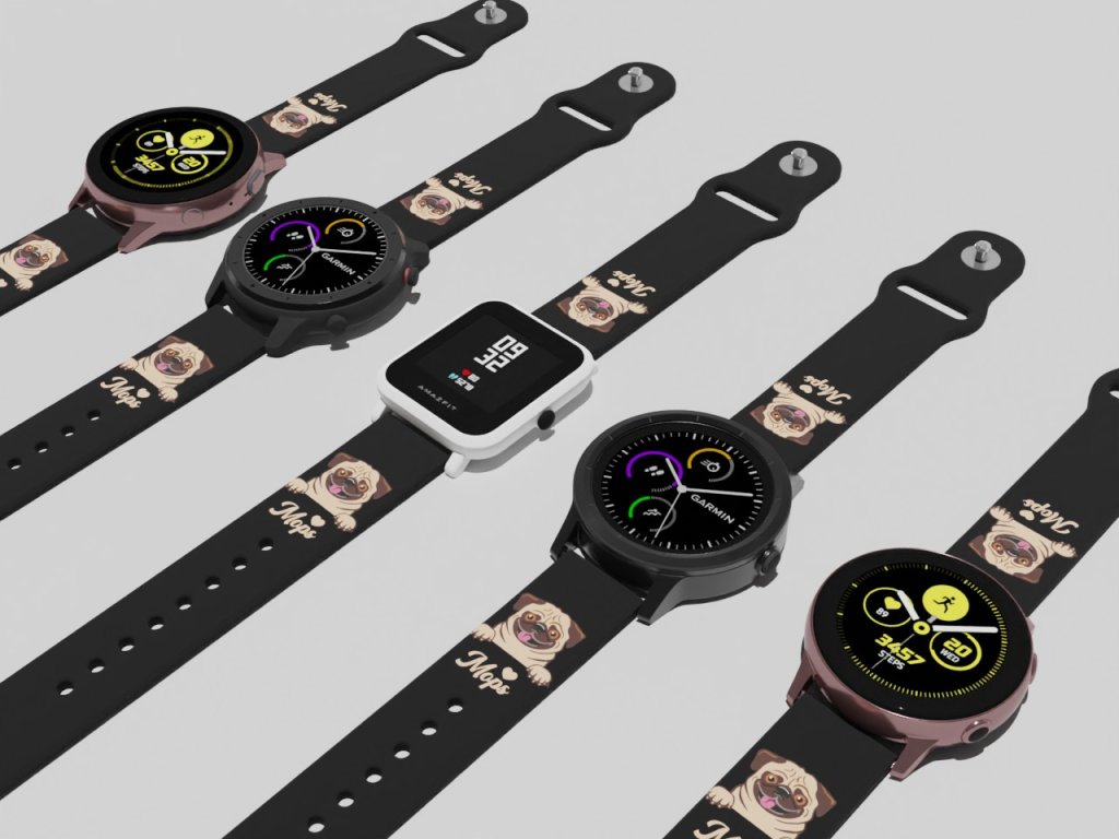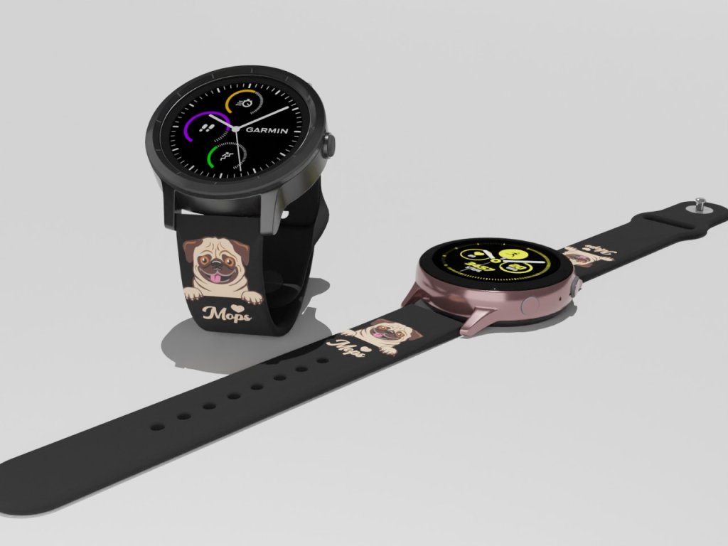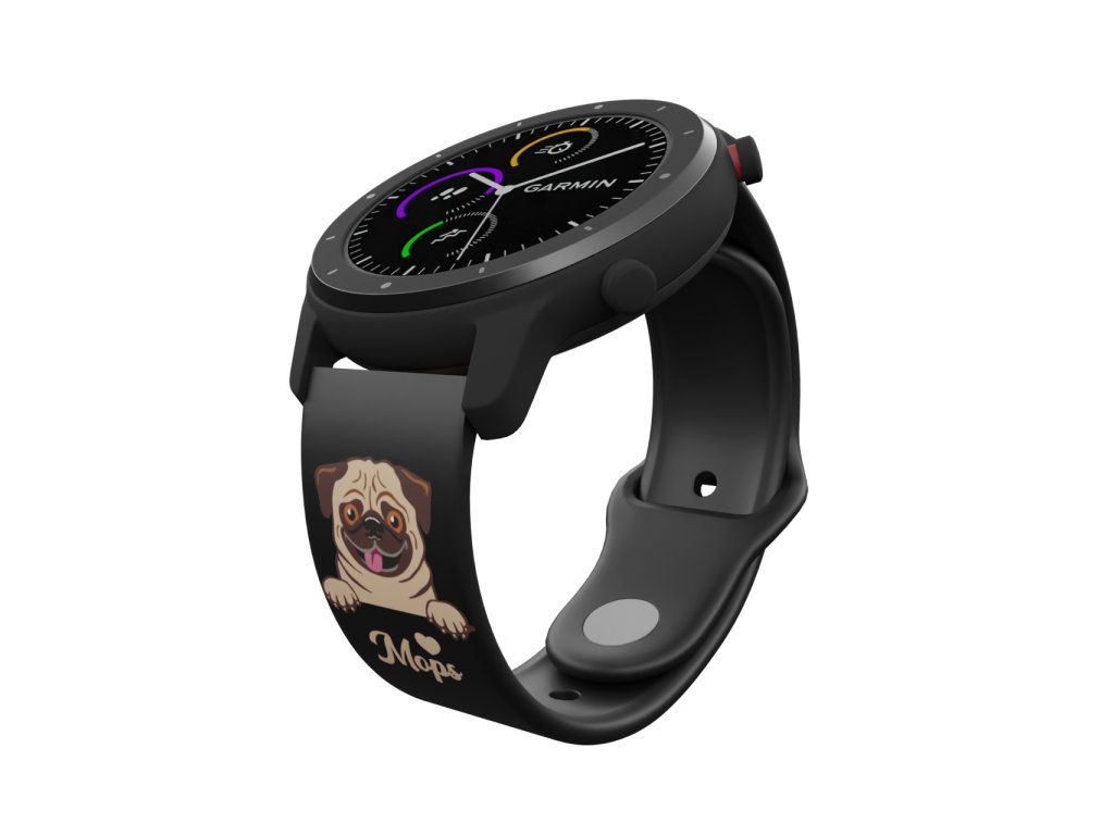 Černý náhradní řemínek s potiskem mopsíka je ideální volba pro všechny milovníky