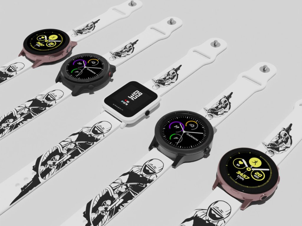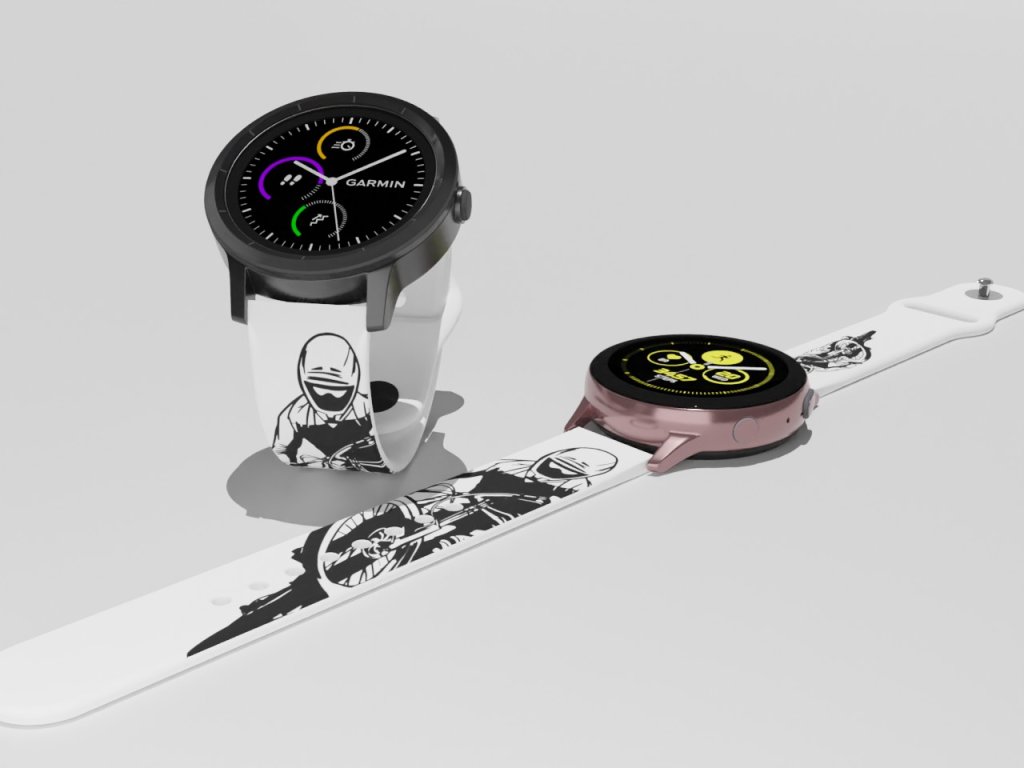 Bílý náhradní řemínek pro chytré hodinky s černým potiskem sjezdového cyklisty.
