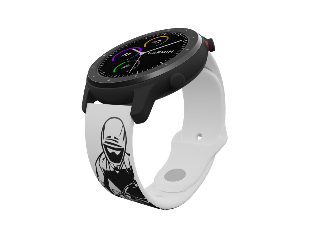Bílý náhradní řemínek pro chytré hodinky s černým potiskem sjezdového cyklisty. Pro milovníky MTB to pravé.