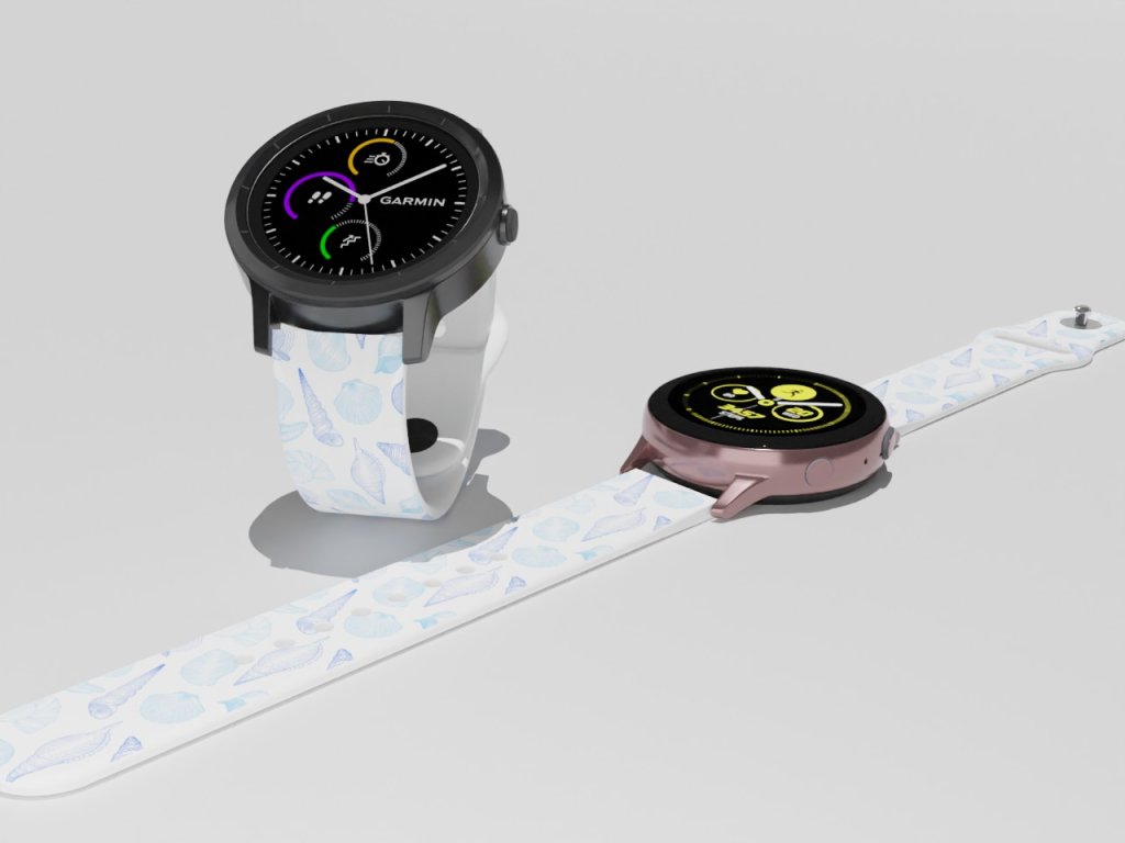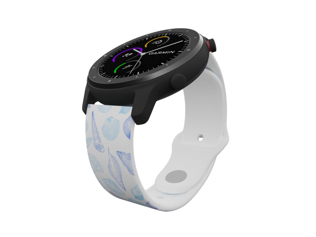 Bílý náhradní řemínek pro chytré hodinky s modrým potiskem mořských mušlí. Zaposlouchejte se do zvuků vzdáleného moře.