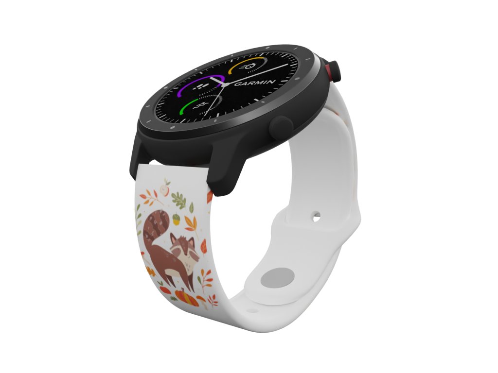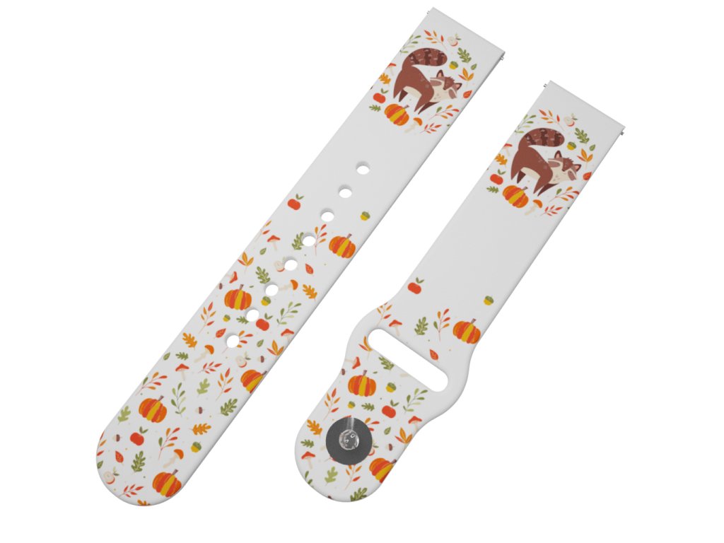Bílý náhradní řemínek pro chytré hodinky s podzimním potiskem s mývalem. Motiv podzimu s roztomilým chlupáčkem v hlavní roli.