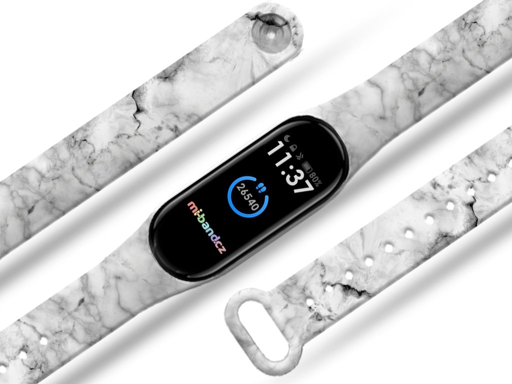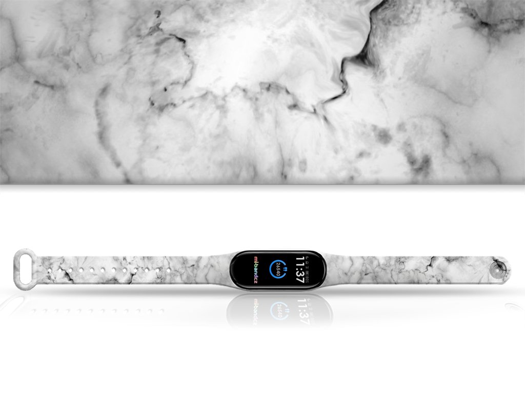 Řemínky pro vás vyrábíme v Ústí nad Labem. Od namíchání barev, přes výrobu samotného řemínku až po finální potisk, který lze i na přání. Náhradní náramek Mi band 3/4/5/6/7 Bílý mramor
