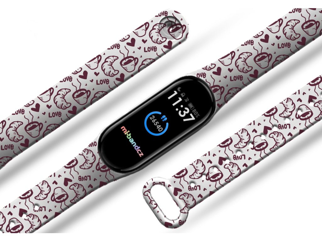 Díky vlastní výrobě i tiskům máme buď skladem nebo vyrobíme a expedujeme obratem. Řemínky pro vás pečlivě a s láskou zabalíme.  Náhradní náramek Mi band 3/4/5/6/7 Káva + Croissant