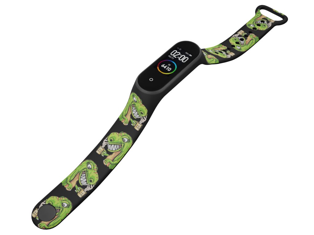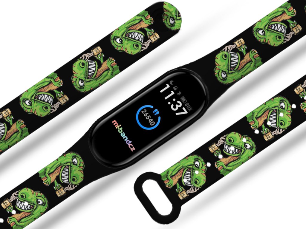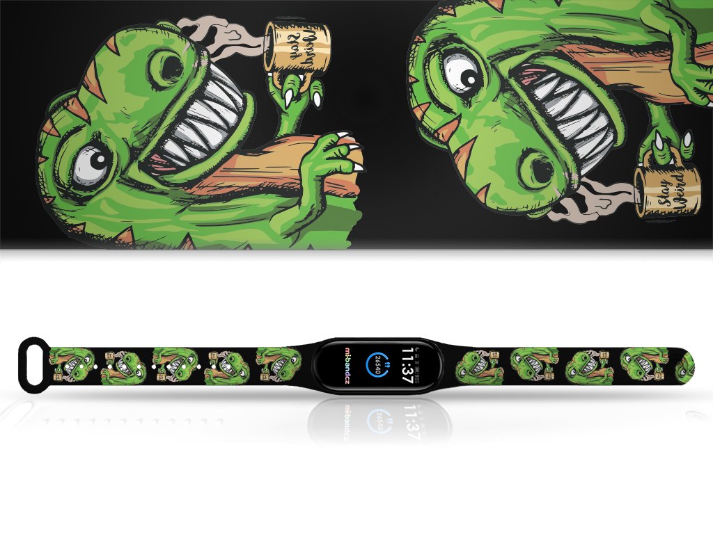 Černý náhradní náramek pro Xiaomi Mi band s potiskem T-Rexe. Potřebuješ energii? Pokud toho na tebe bylo už moc, vzchop se a dej si kávu. Mrkni na náramek pro Mi Band, dinosaurus vypadá připraveně na celý den lovu.