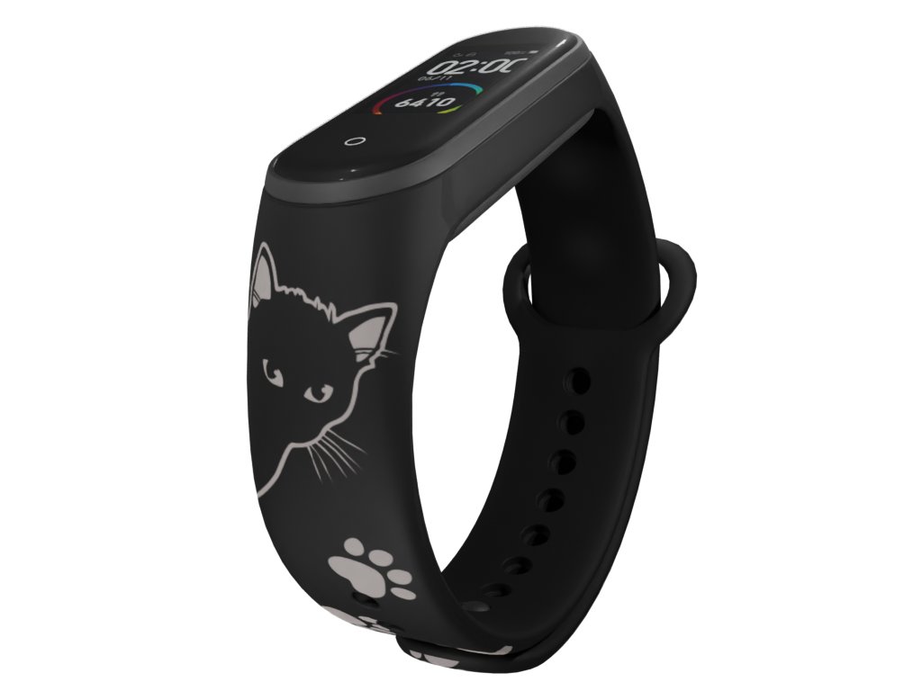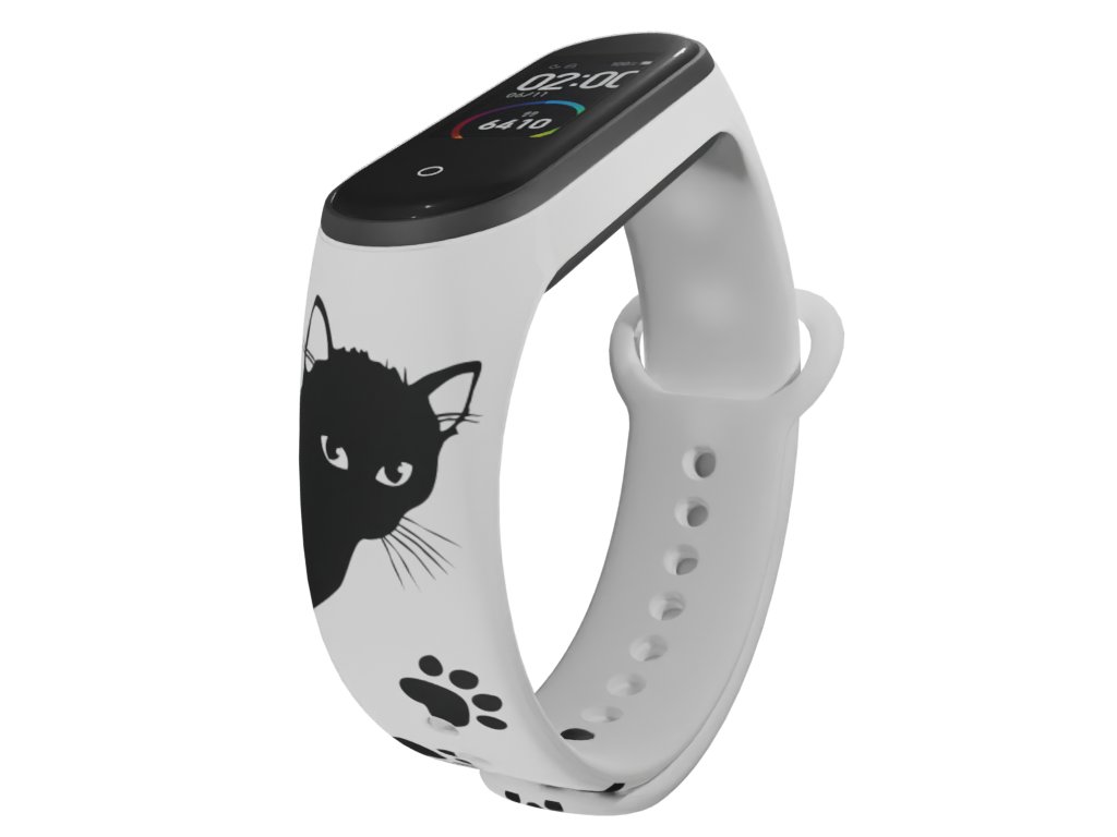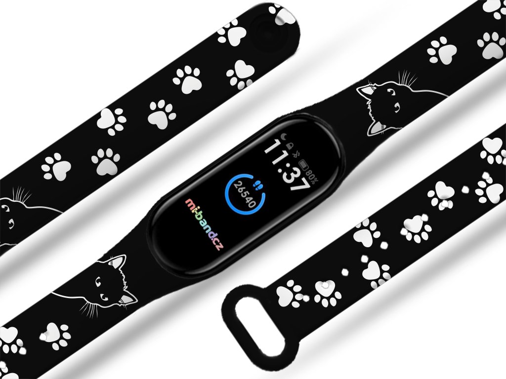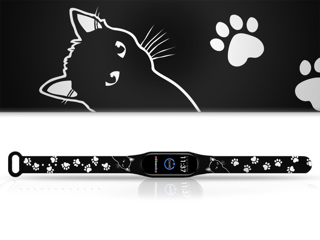 Bílý náhradní náramek pro Xiaomi Mi band s potiskem černého kocourka a jeho tlapiček.