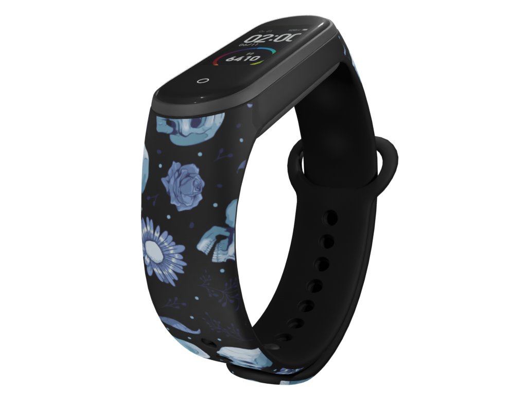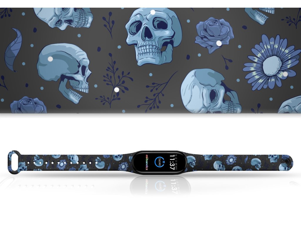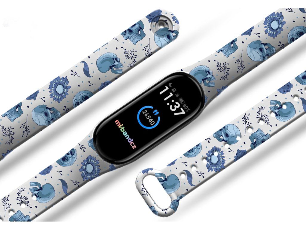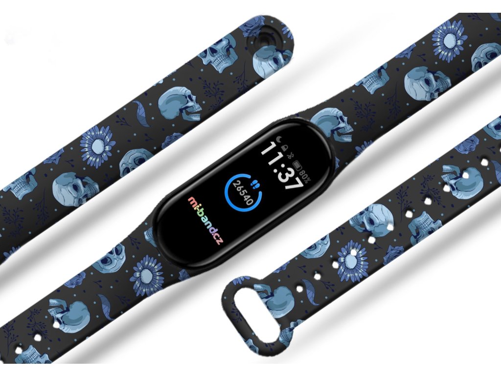 Díky vlastní výrobě i tiskům máme buď skladem nebo vyrobíme a expedujeme obratem. Řemínky pro vás pečlivě a s láskou zabalíme.  Náhradní náramek Mi band 3/4/5/6/7 Modré lebky
