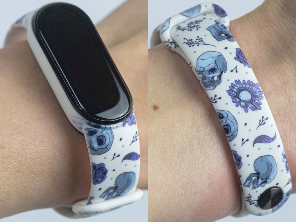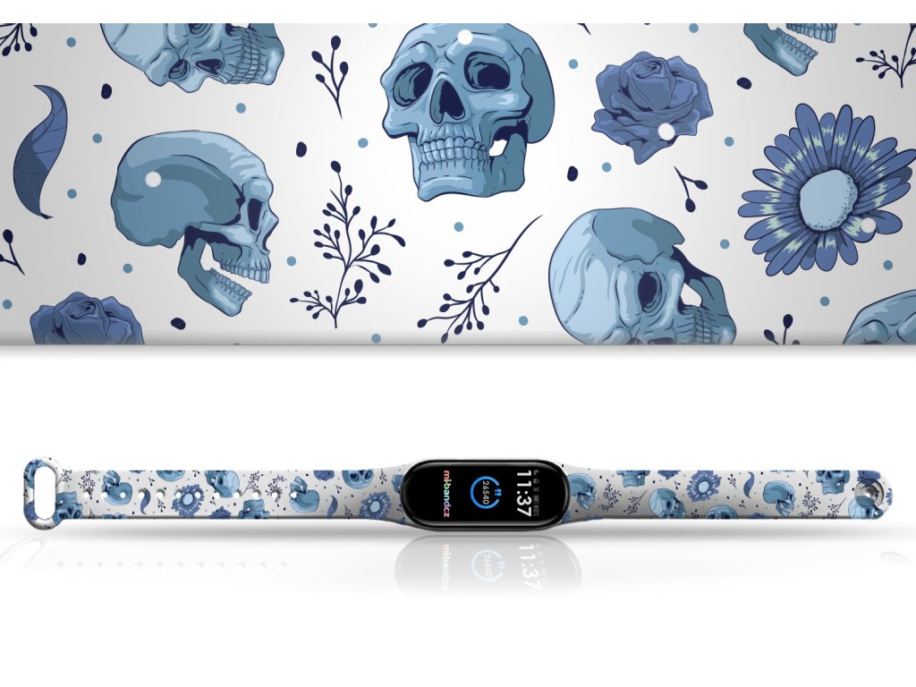 Řemínky pro vás vyrábíme v Ústí nad Labem. Od namíchání barev, přes výrobu samotného řemínku až po finální potisk, který lze i na přání. Náhradní náramek Mi band 3/4/5/6/7 Modré lebky