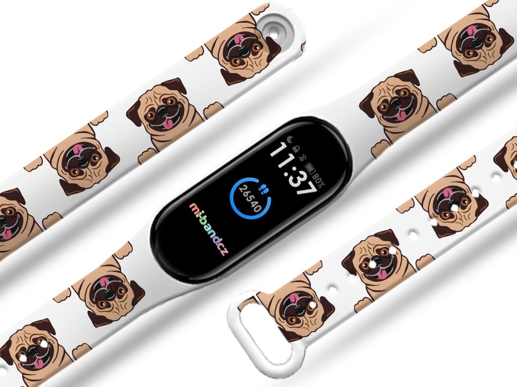 Díky vlastní výrobě i tiskům máme buď skladem nebo vyrobíme a expedujeme obratem. Řemínky pro vás pečlivě a s láskou zabalíme.  Náhradní náramek Mi band 3/4/5/6/7 Mopsík