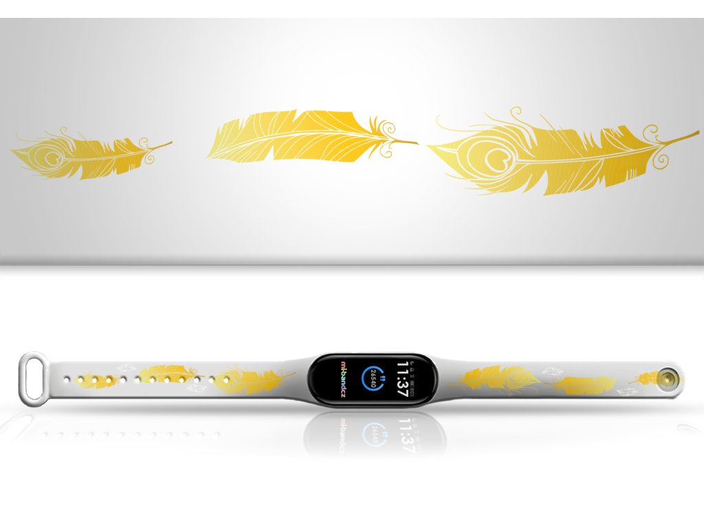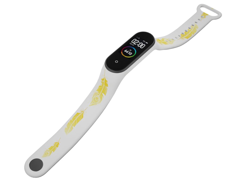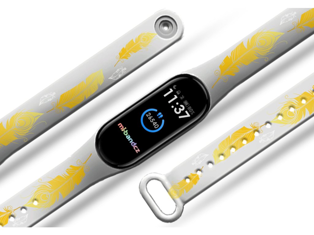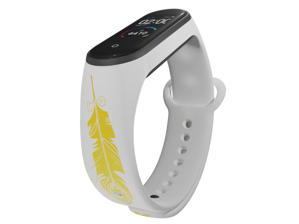 Bílý náhradní náramek pro Xiaomi Mi Band 3/4/5/6/7 s potiskem žlutého peří.
