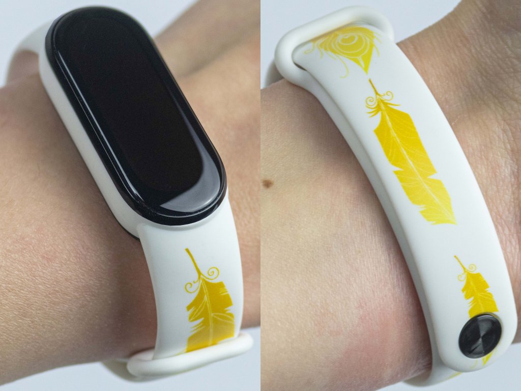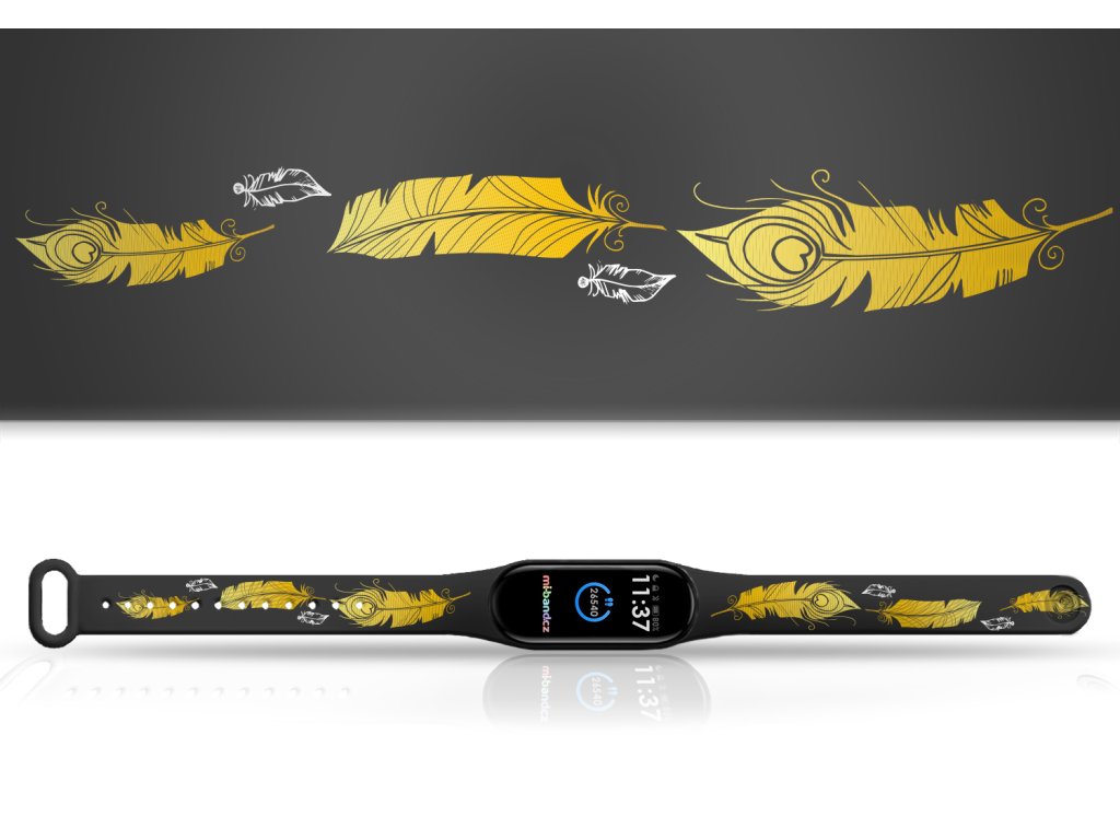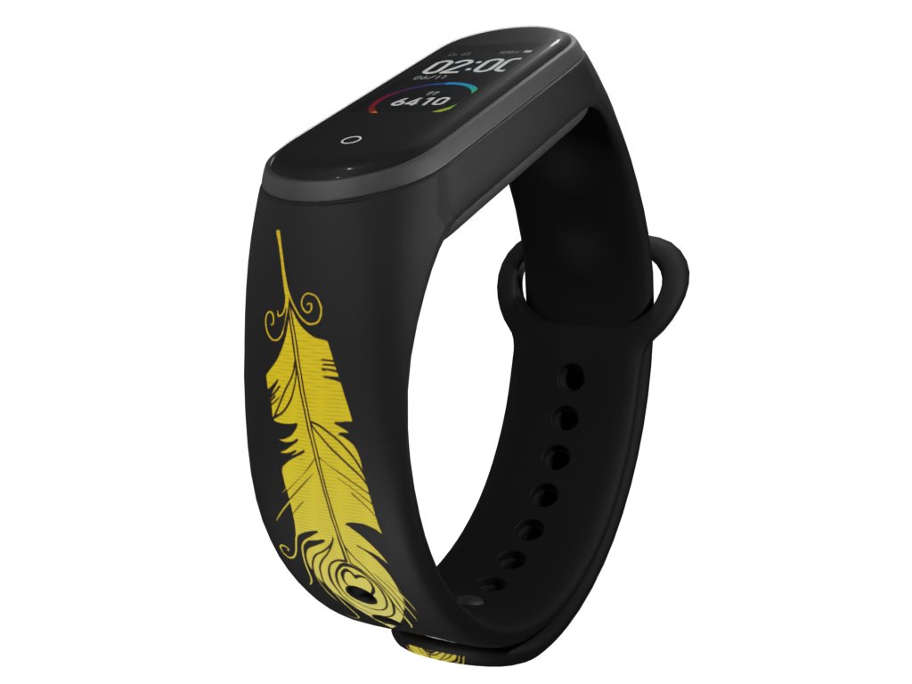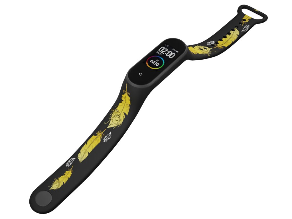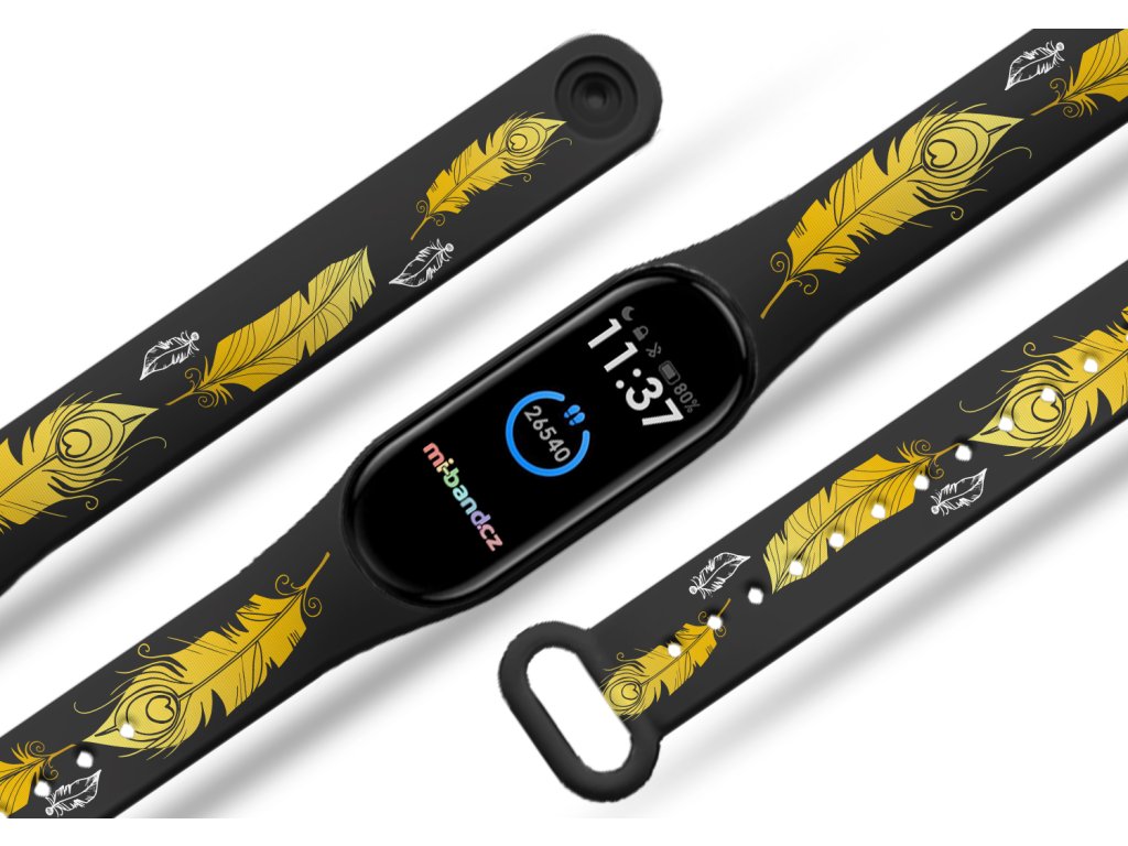 Bílý náhradní náramek pro Xiaomi Mi Band 3/4/5/6/7 s potiskem žlutého peří.