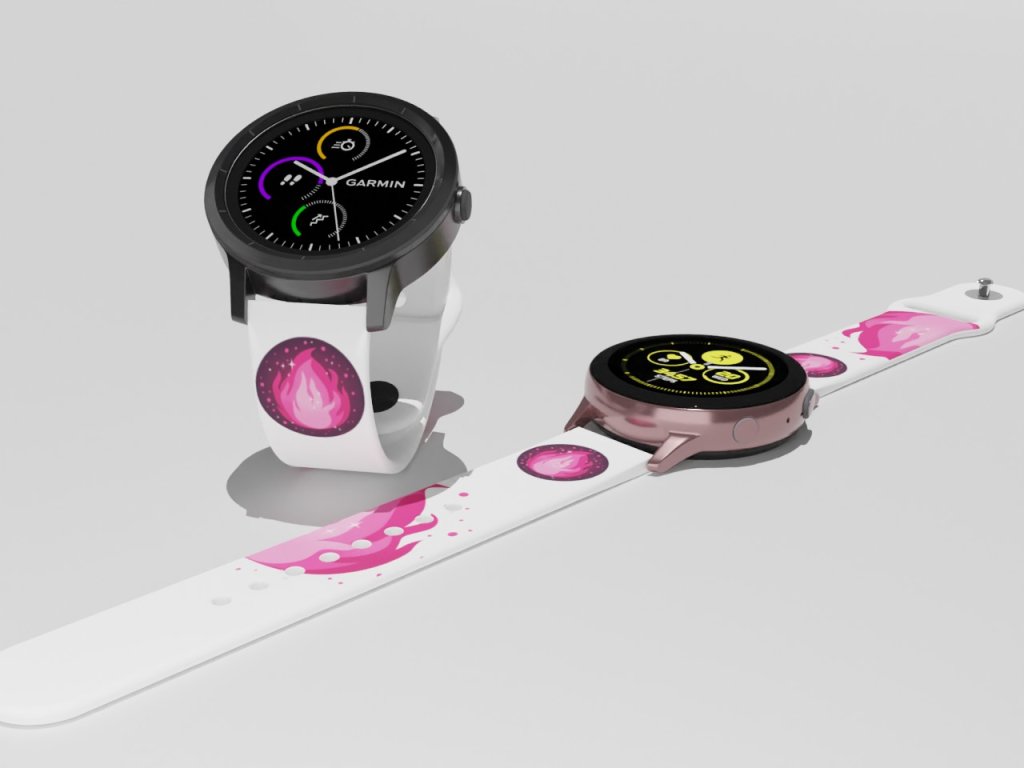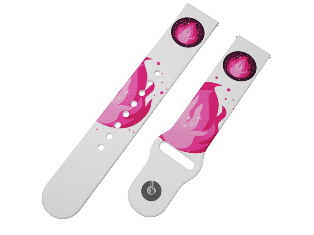 Bílý náhradní řemínek pro chytré hodinky s potiskem zářivě růžového plamene.