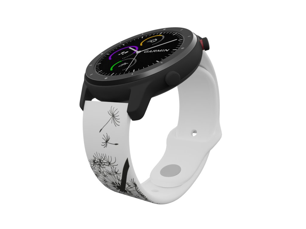 Bílý náhradní řemínek s černou odkvetlou pampeliškou. Foukněte do pampeliškového chomáčku a pošlete malé padáčky do širého kraje. Tyhle vám nikdy neuvadnou.