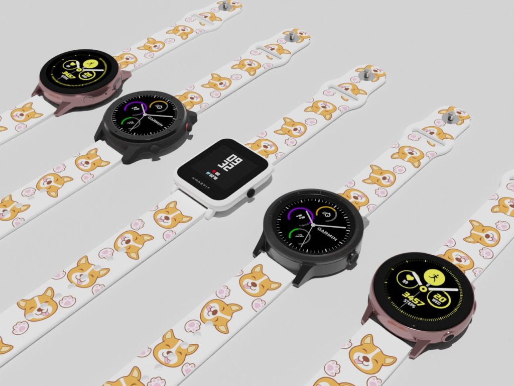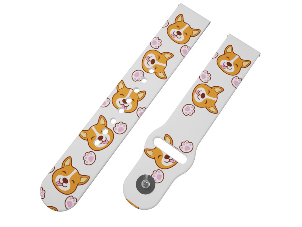 Bílý náhradní řemínek pro chytré hodinky s potiskem roztomilého pejska. Malý zrzavý čumáček na pásku k vašim hodinkám.