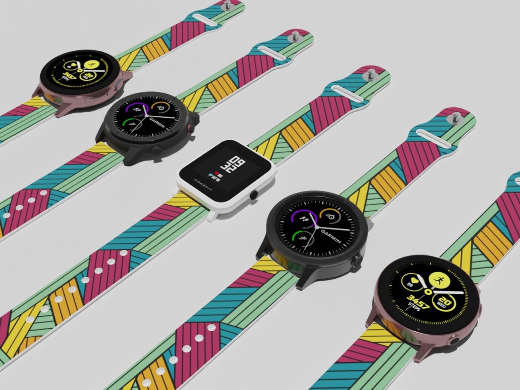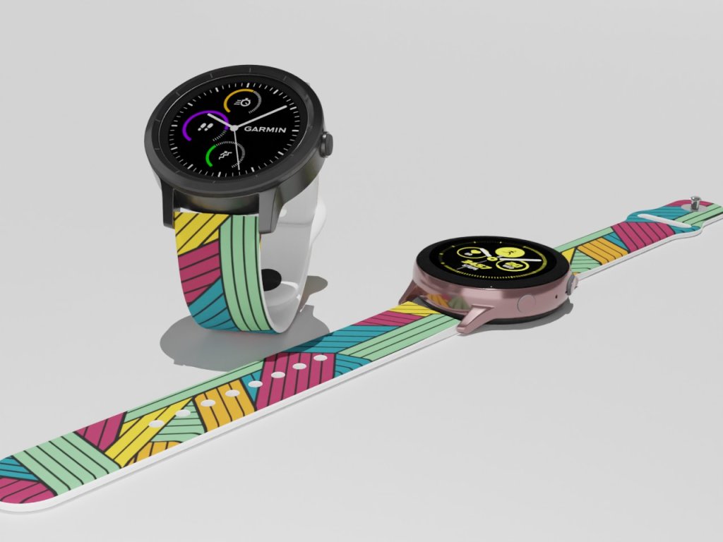 Bílý náhradní řemínek pro chytré hodinky s potiskem barevných pruhů.
