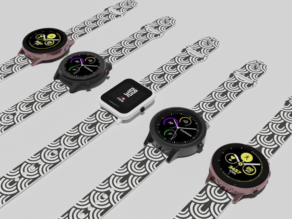 Bílý náhradní řemínek pro chytré hodinky s potiskem černých půlkruhů.