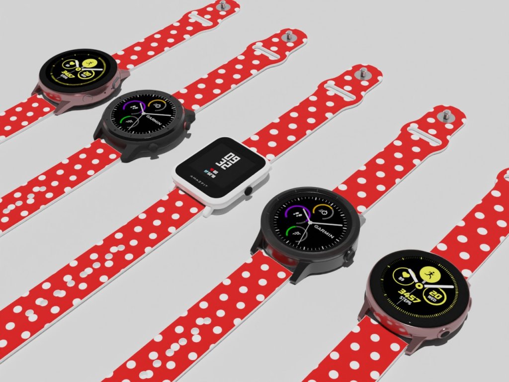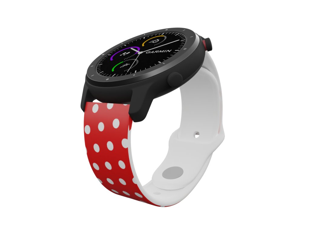 Bílý náhradní řemínek s celoplošným červeným tiskem s bílými puntiky. Veselý stylový doplněk
